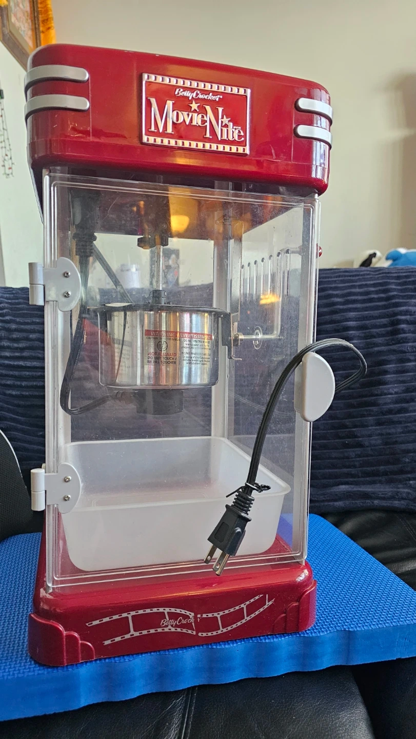This Betty Crocker Movie Nite popcorn machine makes movie nights extra fun. It's red and has a clear popping chamber. Great for parties or family get-togethers.