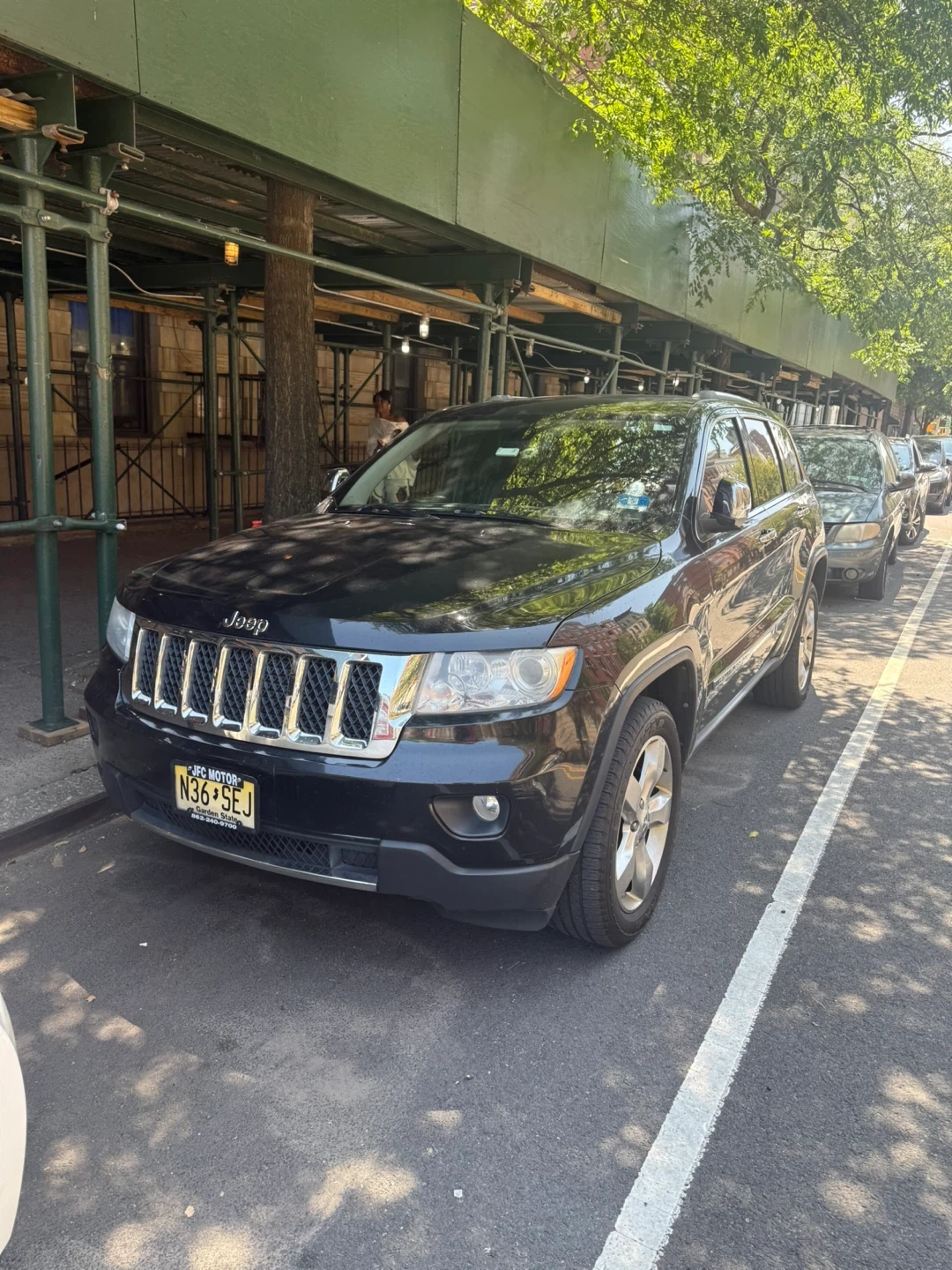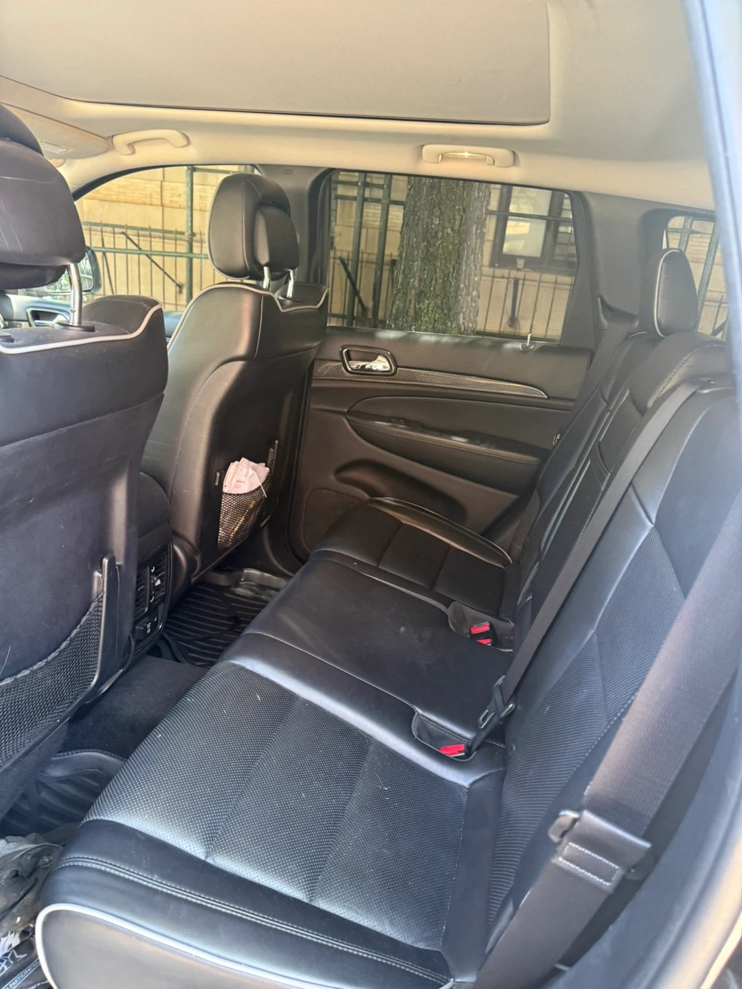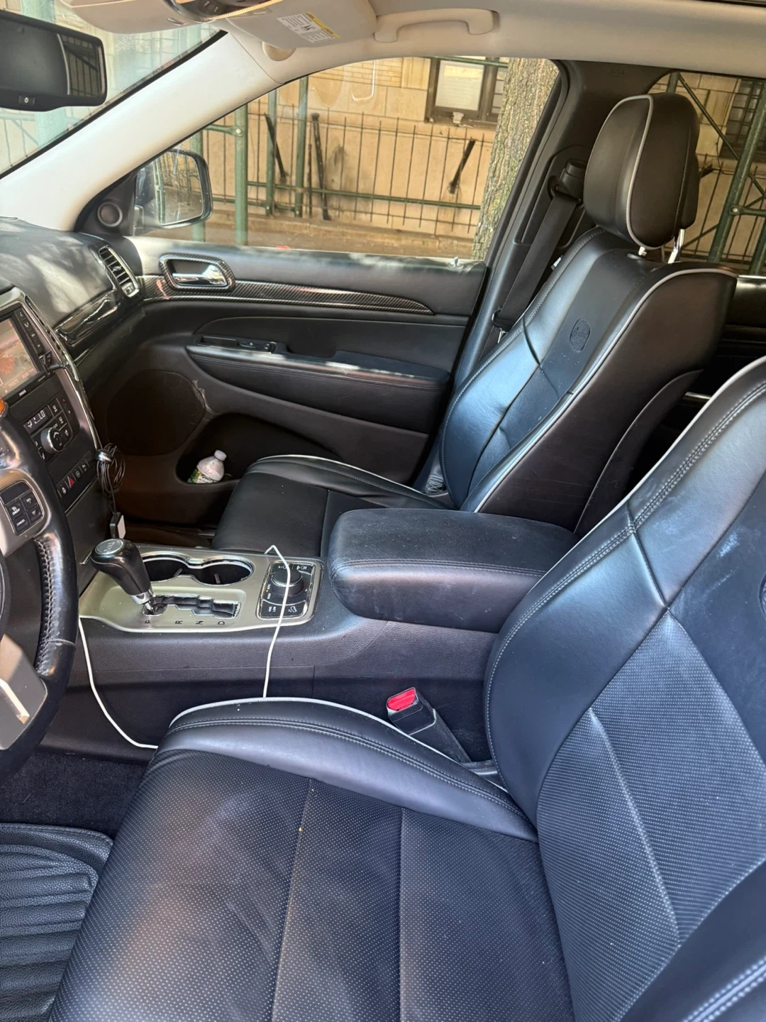 This listing is for a black leather interior from a Jeep Grand Cherokee. It includes front and rear seats with white accent stitching. Features a sunroof and wood-grain steering wheel trim. Front driver's seat shows some wear.