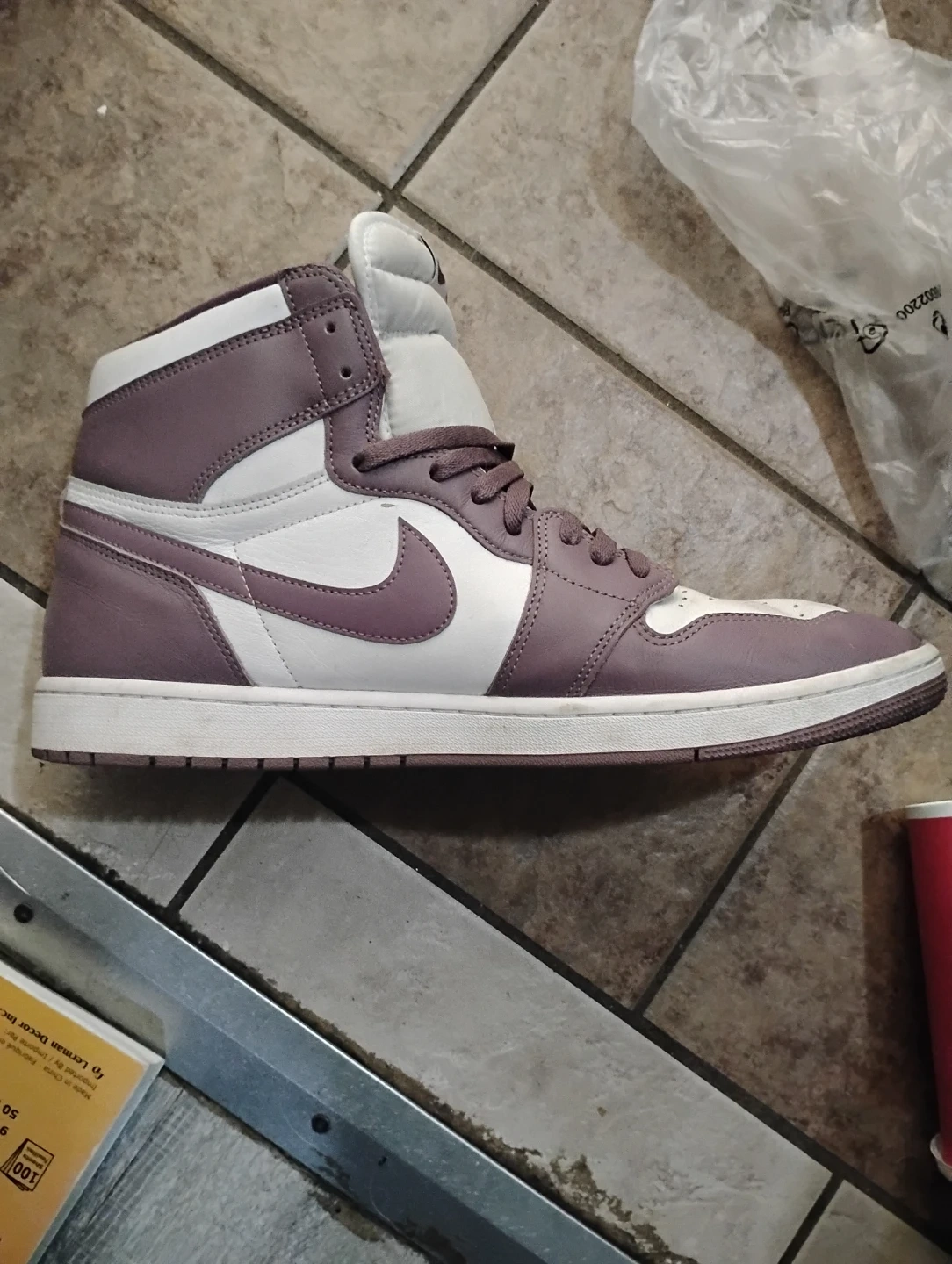 These Nike Air Jordan 1 High SE sneakers come in a mauve and white colourway. They're a classic high-top silhouette with a lace-up closure. This pair is great for casual wear or completing a streetwear look! Size 15, price may be negotiable for serious buyers