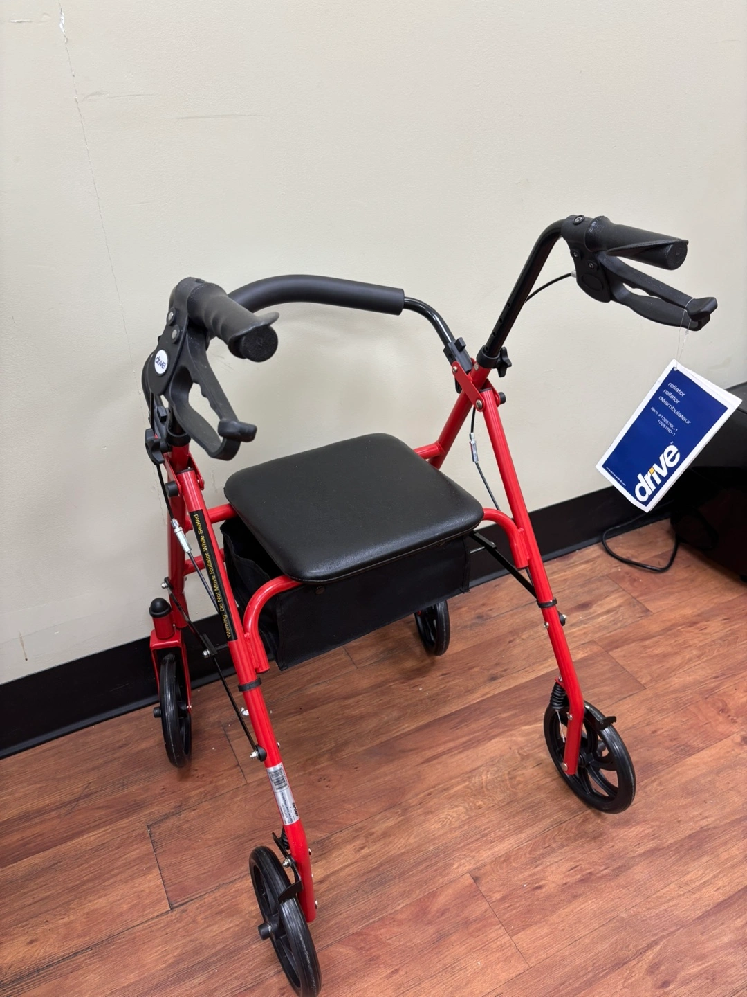 Lightweight, red rolling walker. Features a padded seat and brakes. Four wheels for easy manoeuvrability. Ideal for seniors or those with mobility issues.
