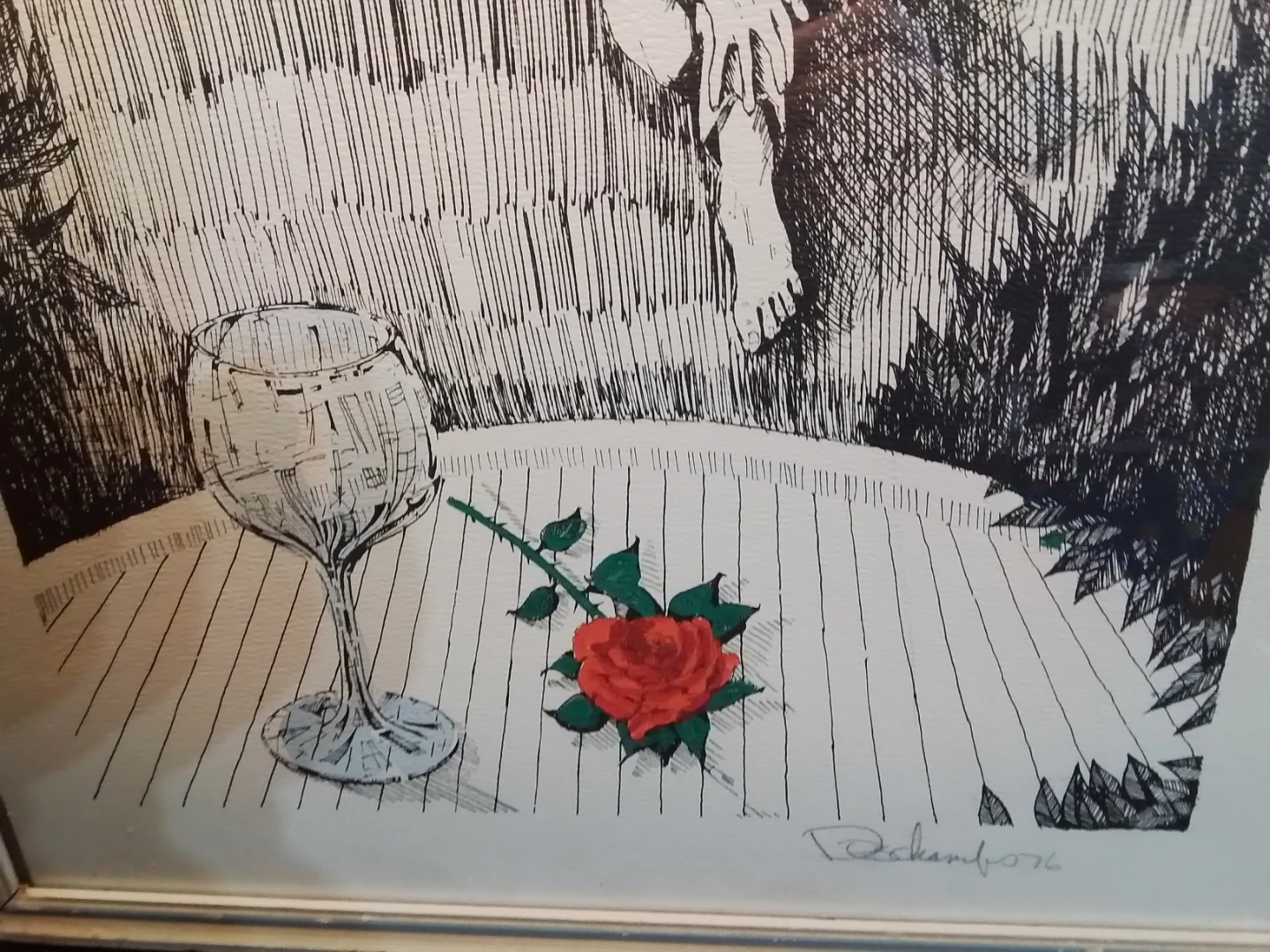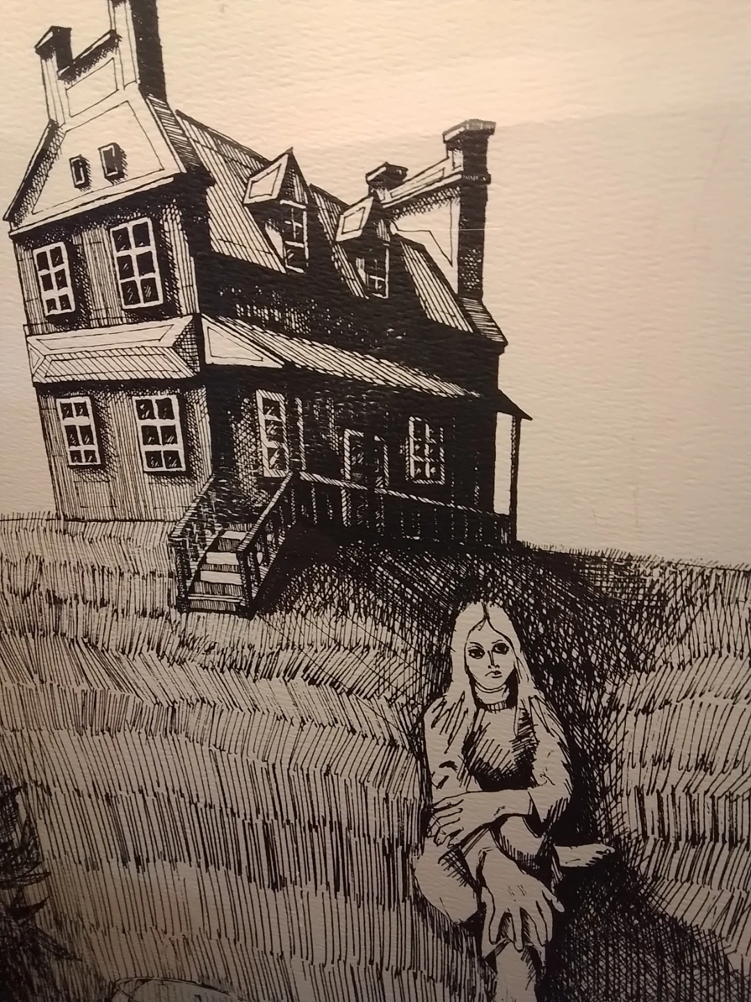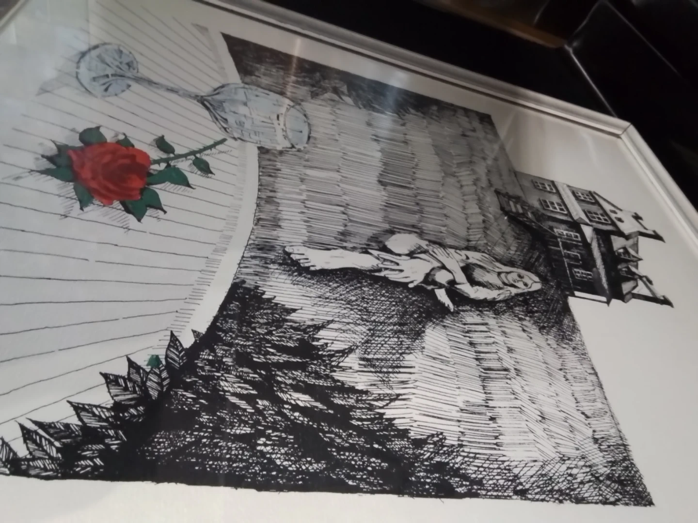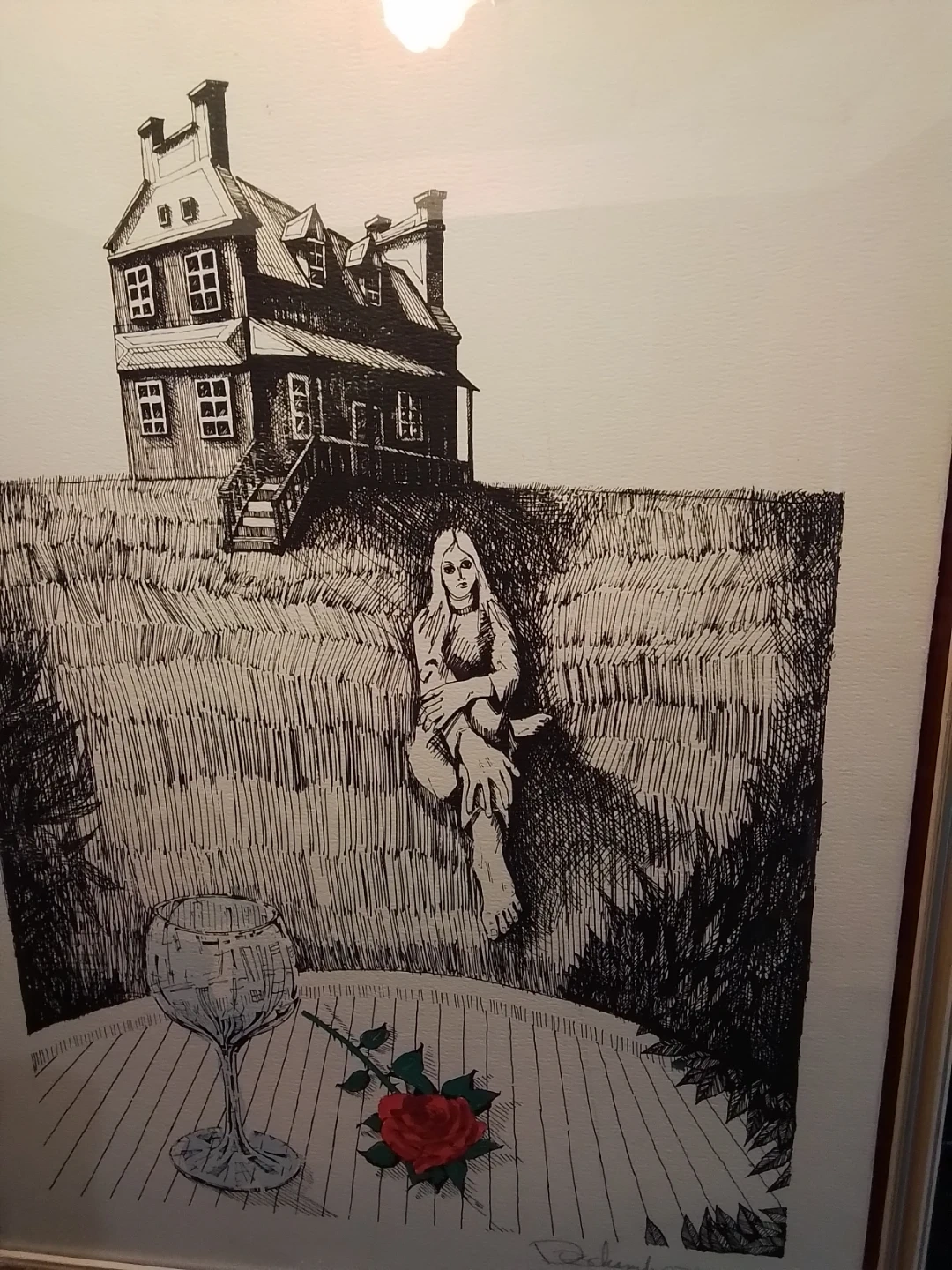 This vintage mixed media artwork, signed Duchamfo in '76, is a unique find. Measuring 17.5x22.5 inches, the piece features a surreal depiction of a house, a figure, and still life elements in black ink. The art is framed and ready to hang, adding a touch of vintage charm to any room. The art is in good condition for its age.