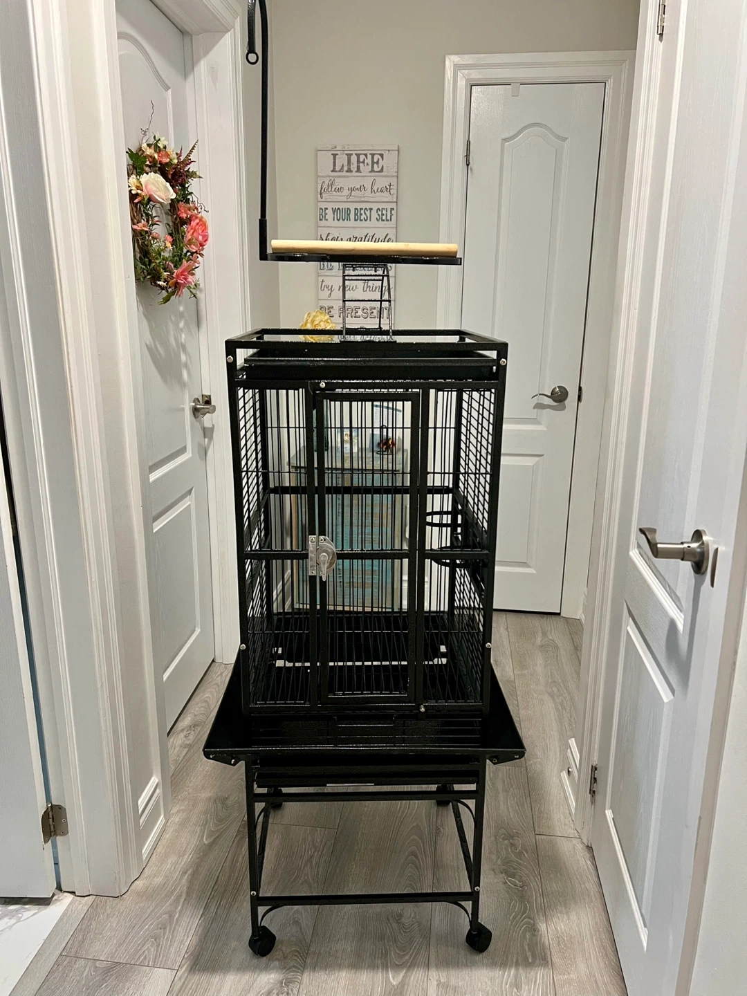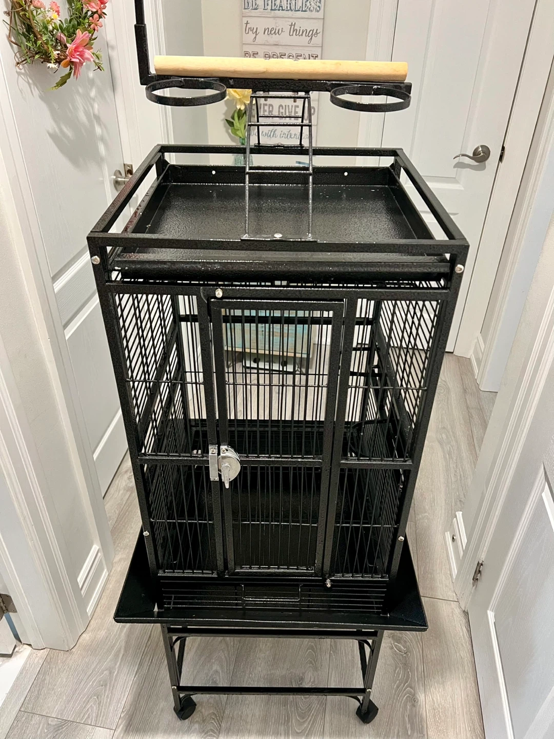 Spacious black bird cage perfect for medium to large parrots. It includes a wooden perch on top and is mounted on a wheeled stand for easy mobility. The cage features a secure latch and a pull-out tray for convenient cleaning.