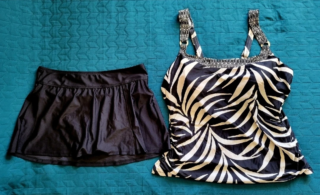 This Krista swim set includes a black swim skirt and a black and white zebra print tankini top. They're both made from a stretchy, quick-dry fabric. The tankini features decorative trim and ruching on the sides.