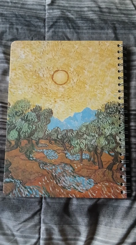 This spiral notebook features artwork inspired by Van Gogh's "The Starry Night" on the front cover and "Olive Trees" on the back. It's great for sketching, journaling, or jotting down notes. The pages are blank and ready for your creativity!