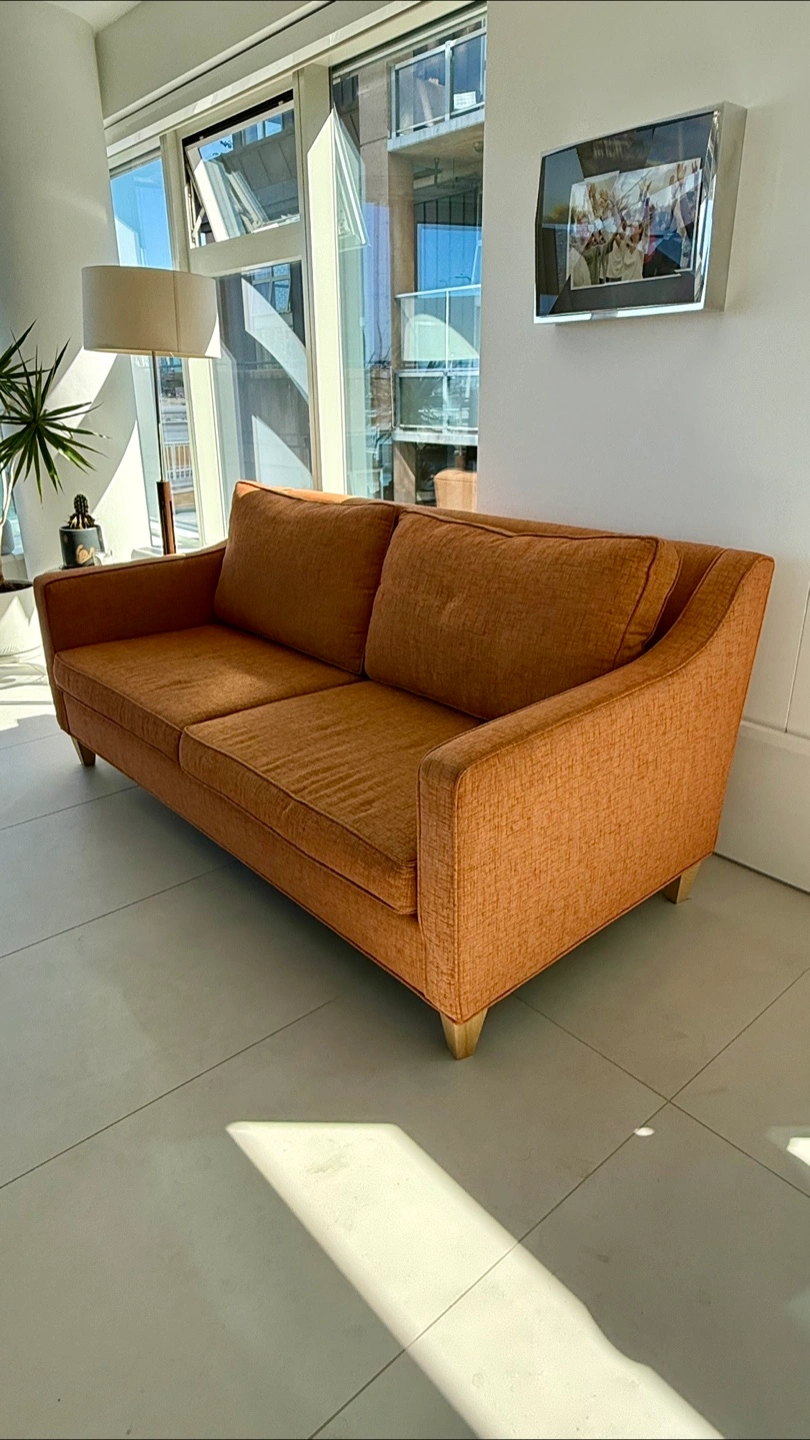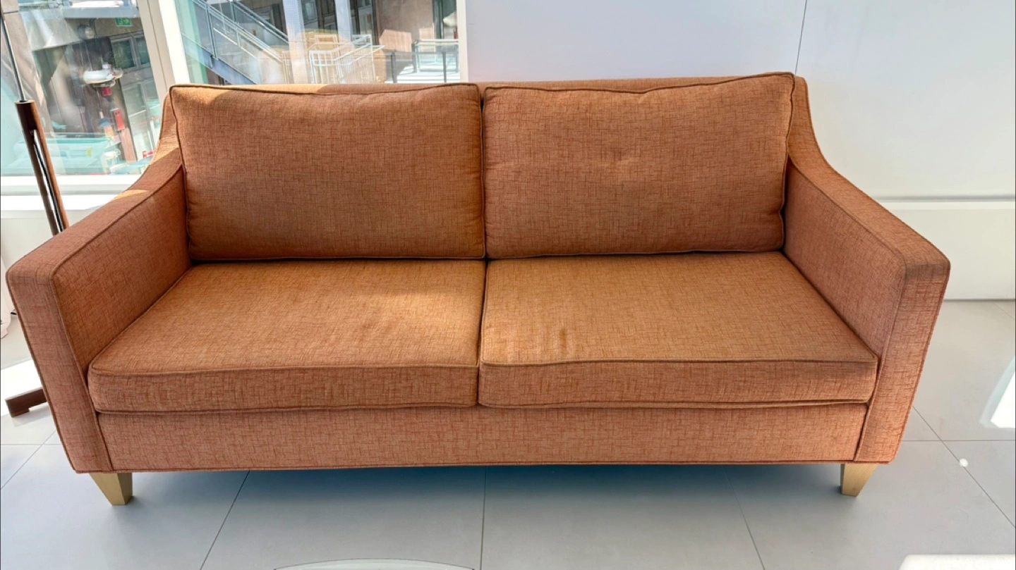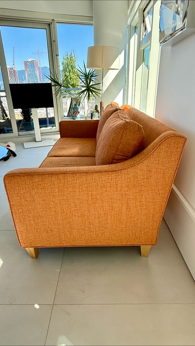 Selling a comfy orange sofa! It's in great condition and would look great in any living room. The colour is a warm orange and the material is durable and soft.