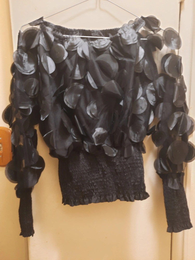 Here's a stylish black long-sleeve blouse with a unique design! It features a sheer fabric with circular accents and a comfortable, stretchy smocked waist and cuffs. Perfect for adding a touch of elegance to your wardrobe