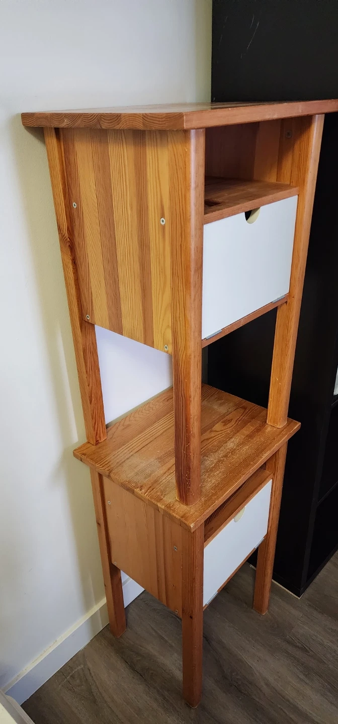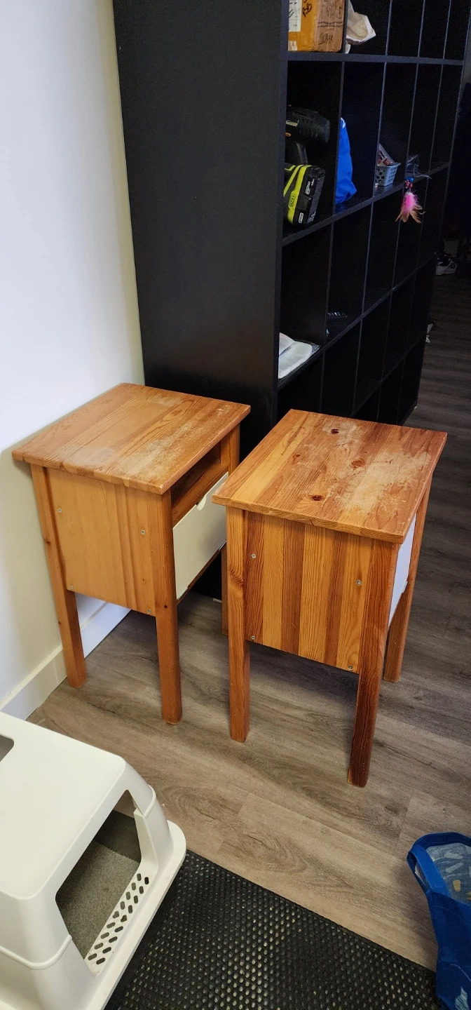 Set of two wood nightstands. Each nightstand features a pull-down. Drawer for storage. Natural wood finish with a rustic appeal. There plenty of storage with 2 storage areas.