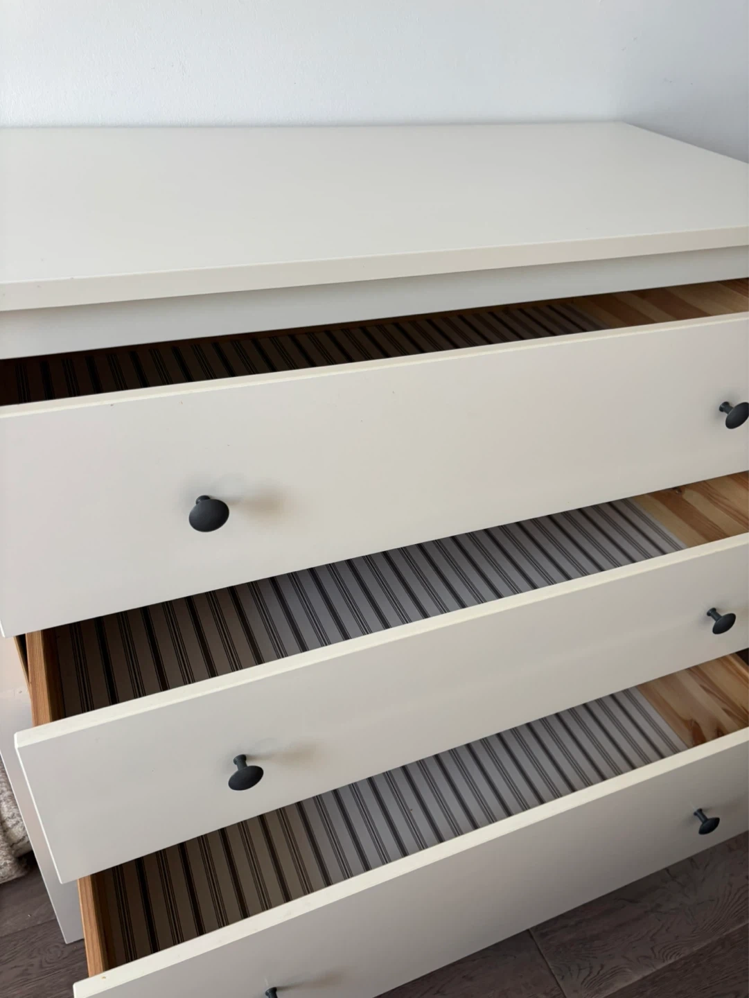 White dresser with four drawers, featuring black knobs. The drawer interiors are lined with a striped fabric. Includes labels on drawers indicating weight limits.