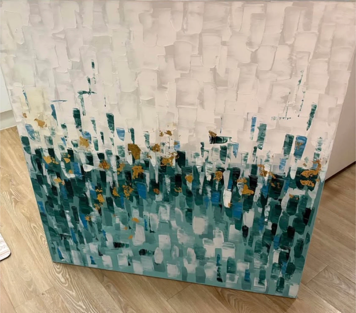 This textured abstract painting features a palette of deep greens, blues, and crisp whites. It's enhanced with shimmering gold leaf accents throughout. A lovely piece to add a touch of modern elegance to any room!