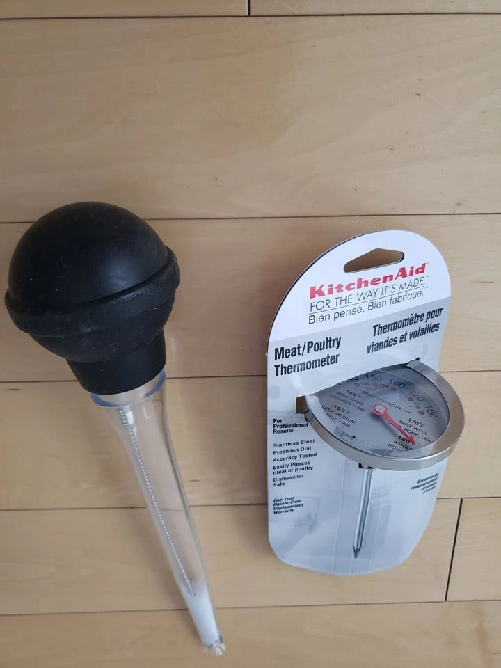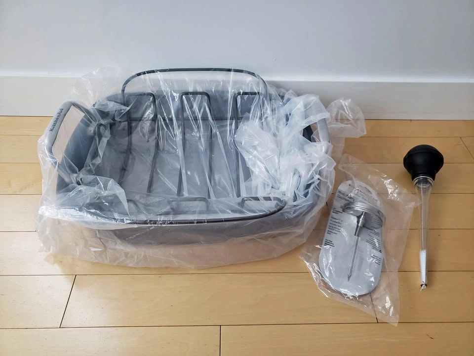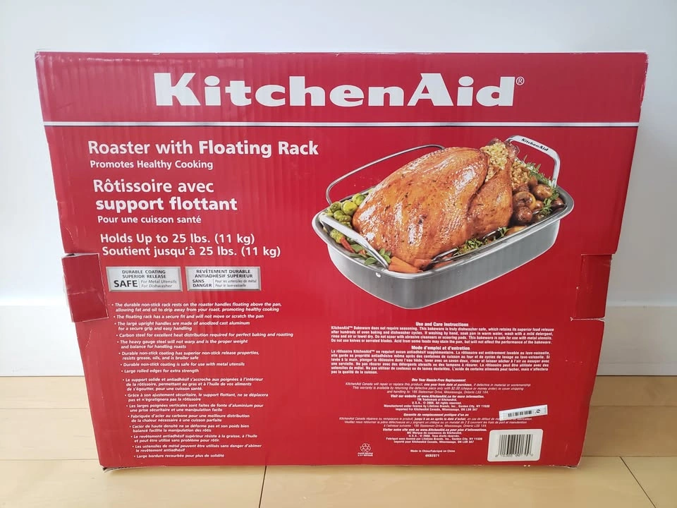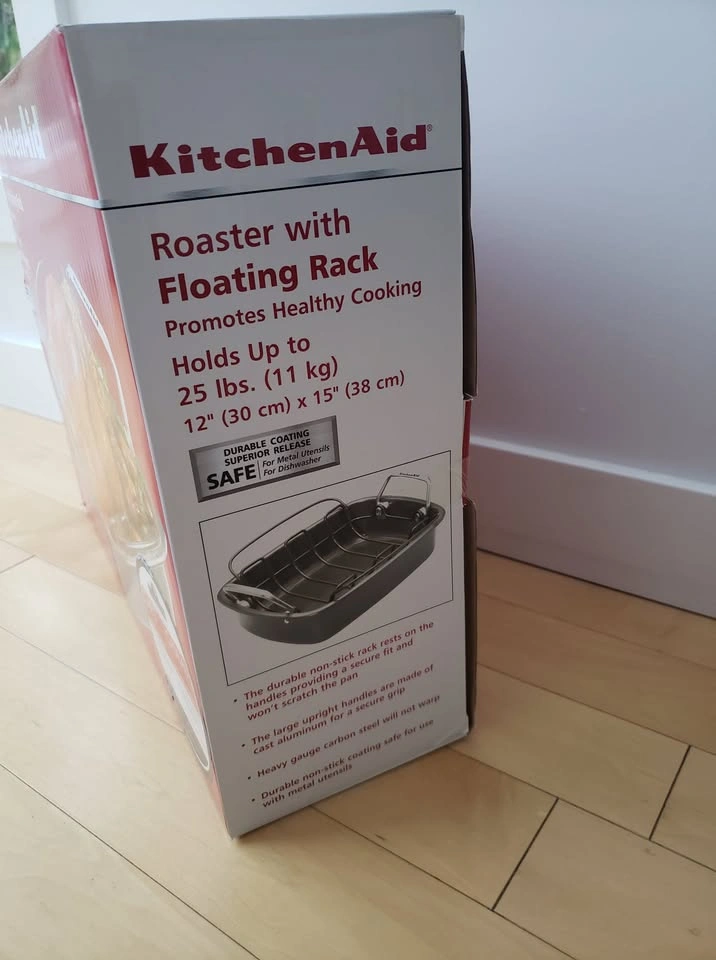 Selling a brand new KitchenAid roaster with floating rack. Dimensions: 12" (30 cm) x 15" (38 cm). Holds up to 25 lbs. - The durable non-stick rack rests on the handles providing a secure fit and won't scratch the pan - The large upright handles are made of cast aluminum for a secure grip - Heavy gauge carbon steel will not warp - Durable non-stick coating safe for use with metal utensils. Includes a brand new KitchenAid baster & brand new KitchenAid meat thermometer. Comes from a smoke & pet free home.