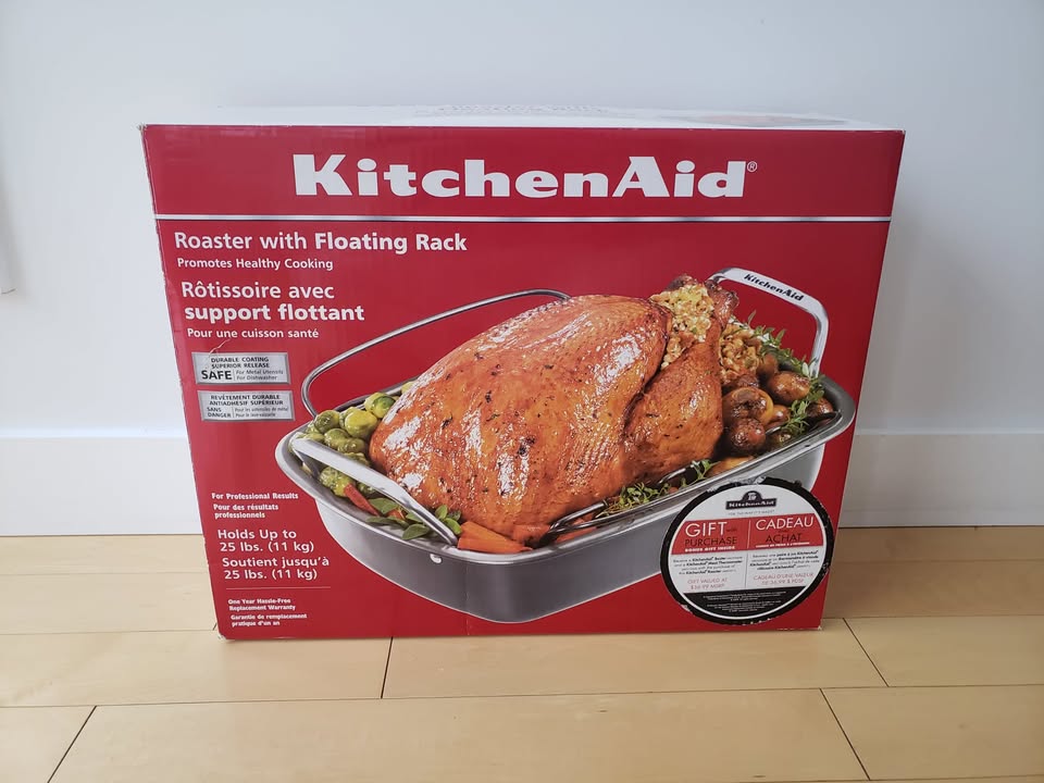 Selling a brand new KitchenAid roaster with floating rack. Dimensions: 12" (30 cm) x 15" (38 cm). Holds up to 25 lbs. - The durable non-stick rack rests on the handles providing a secure fit and won't scratch the pan - The large upright handles are made of cast aluminum for a secure grip - Heavy gauge carbon steel will not warp - Durable non-stick coating safe for use with metal utensils. Includes a brand new KitchenAid baster & brand new KitchenAid meat thermometer. Comes from a smoke & pet free home.