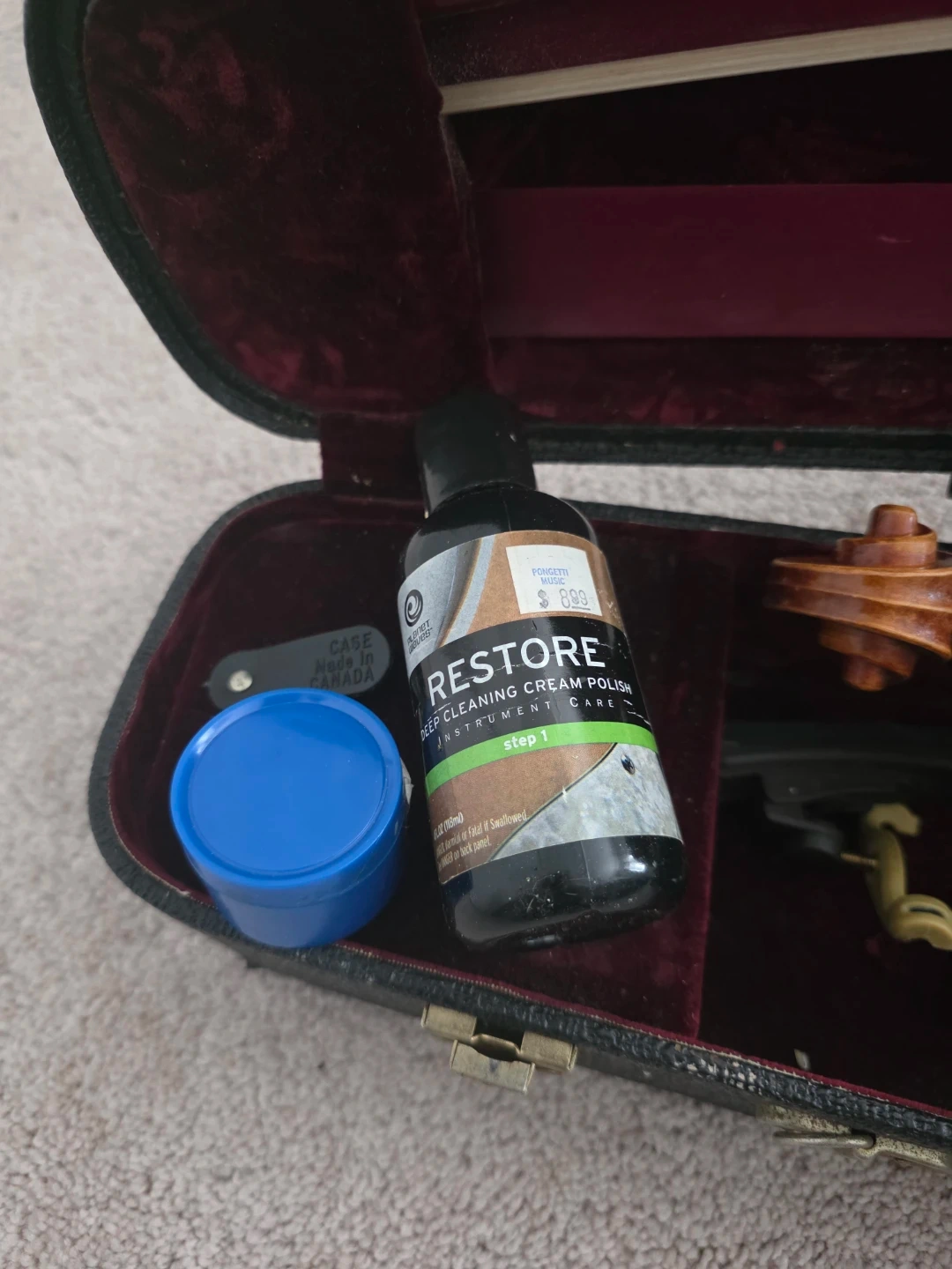 This is a violin outfit complete with a case, bow, and tuner. It also includes a bottle of Restore instrument polish and rosin. The Intellitouch tuner is included for precise tuning.