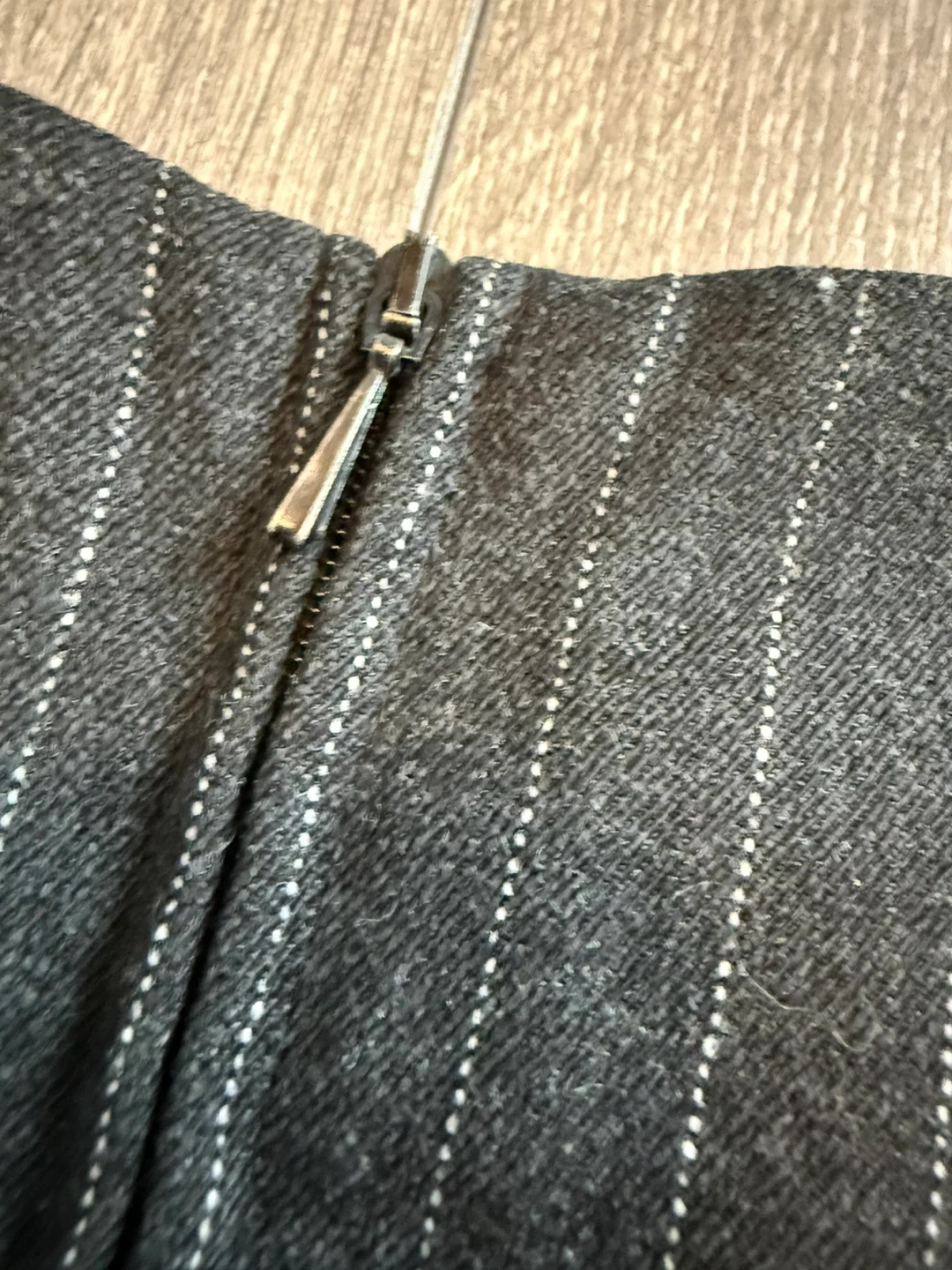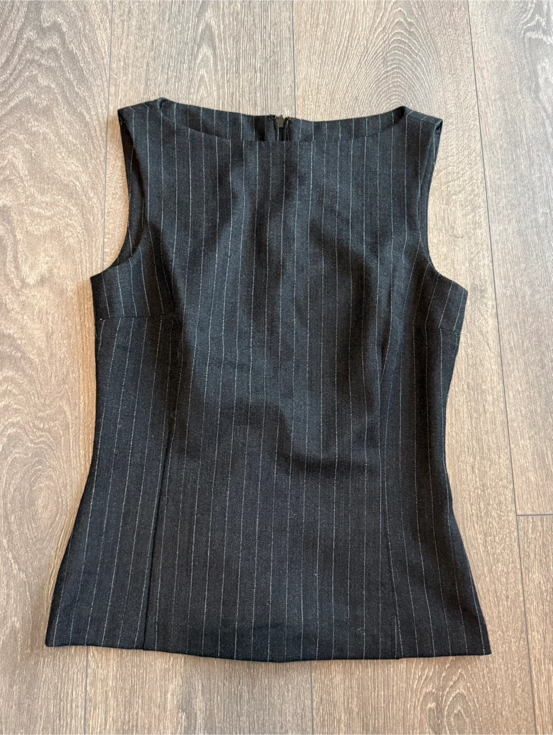 This is a Dolce & Gabbana pinstripe sleeveless vest top. Made in Italy, it's a blend of polyester, wool, and elastane. It features a zip closure at the back.