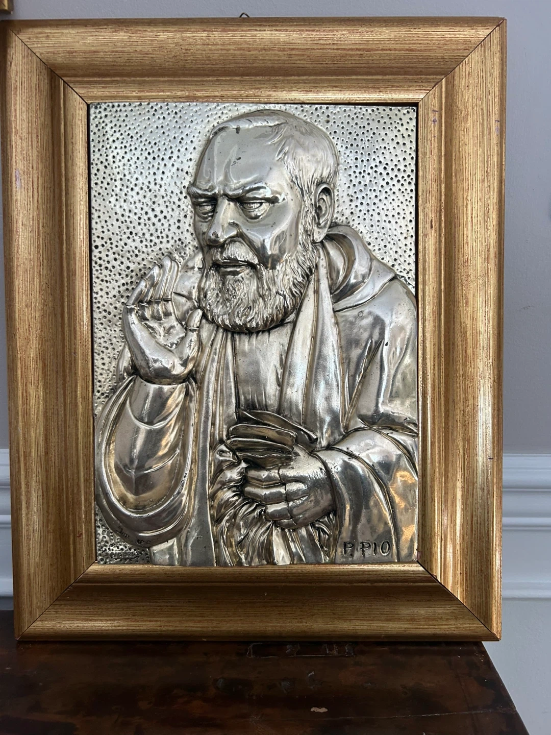 This is a metal relief artwork featuring Padre Pio in a gold-tone wooden frame. The background has a textured speckled pattern. The signature 'P. PIO' is visible on the lower right.