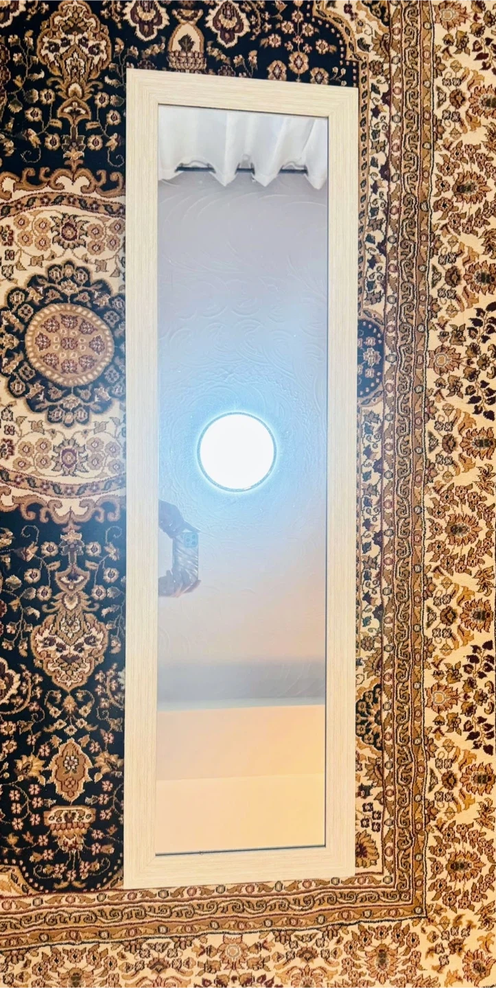 This is a brand new full length mirror with a clean white frame. It's perfect for checking your outfit before heading out. The mirror measures 14 inches wide and 49 inches tall.