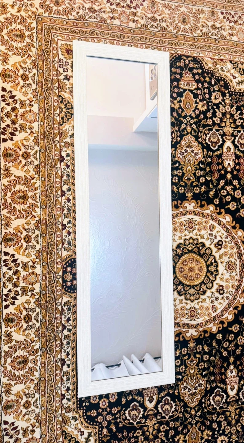 This is a brand new full length mirror with a clean white frame. It's perfect for checking your outfit before heading out. The mirror measures 14 inches wide and 49 inches tall.
