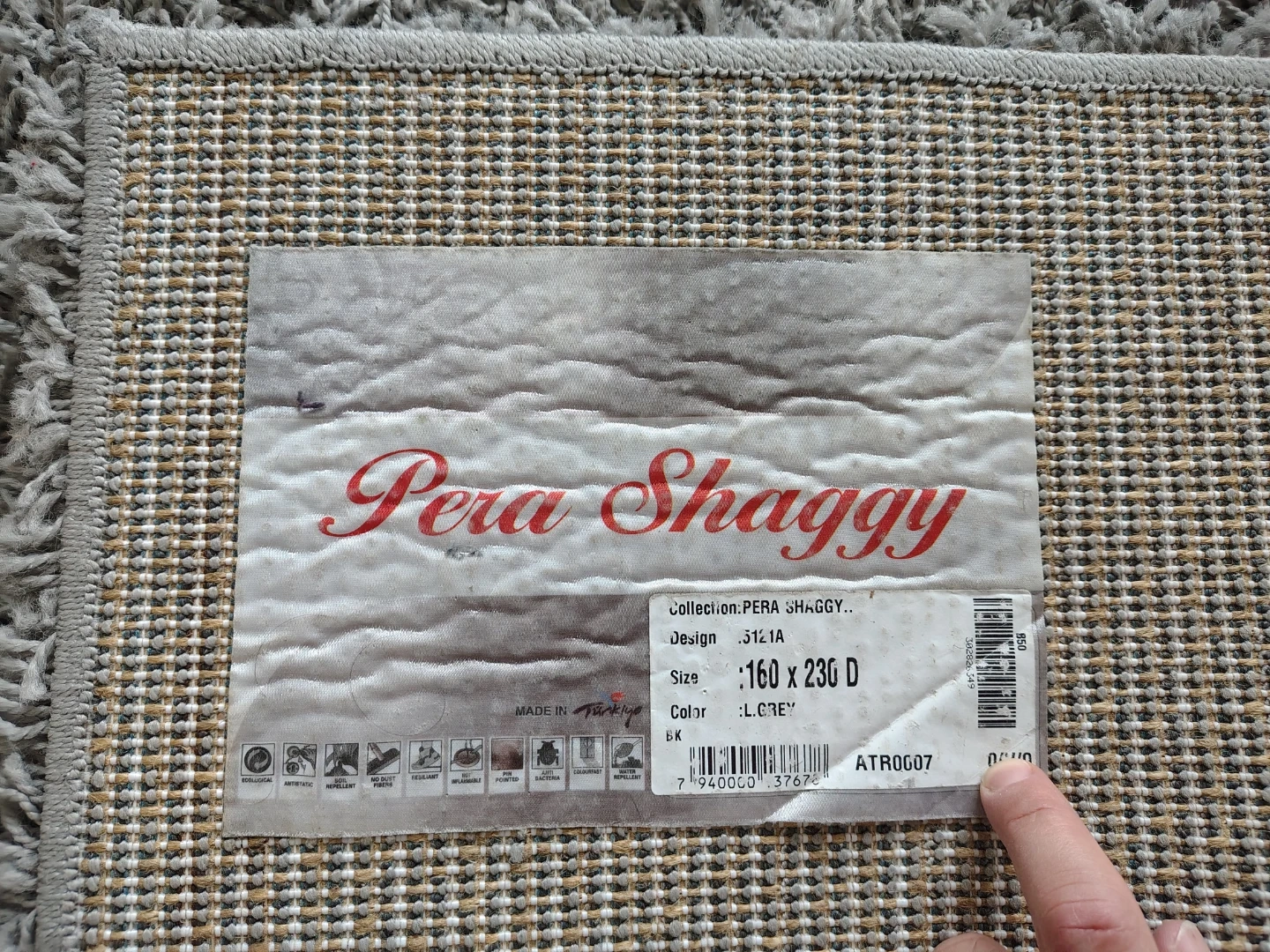 Selling a Pera Shaggy rug in light grey! It's in great condition and measures 160 cm by 230 cm. This rug will add a cozy touch to any room.
