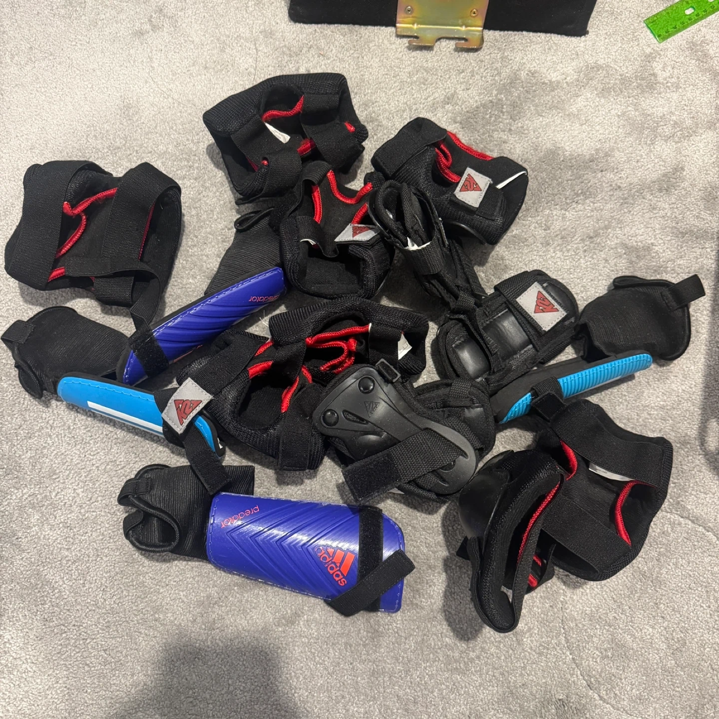Selling a set of Adidas Predator youth soccer shin guards, knee pads and pads. They are black with red and blue accents. Great for protecting your little athlete during soccer practice and games!
