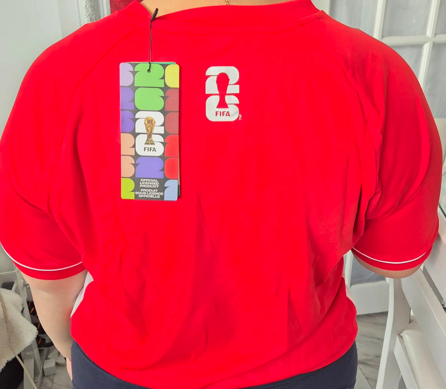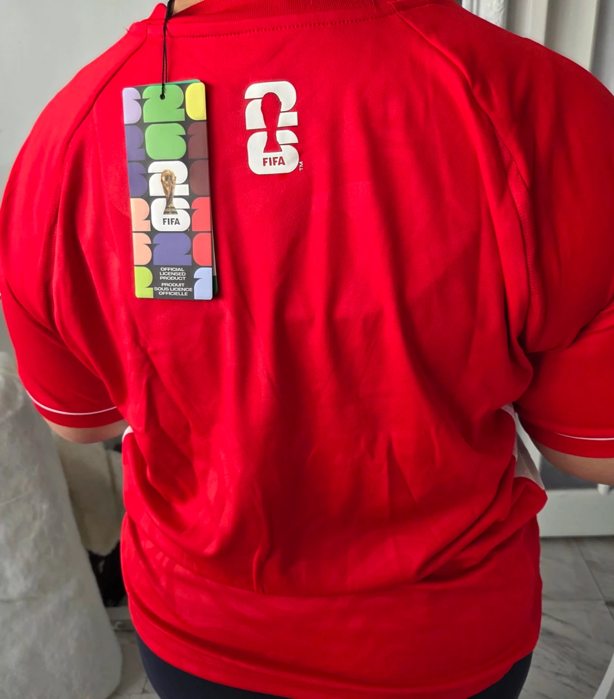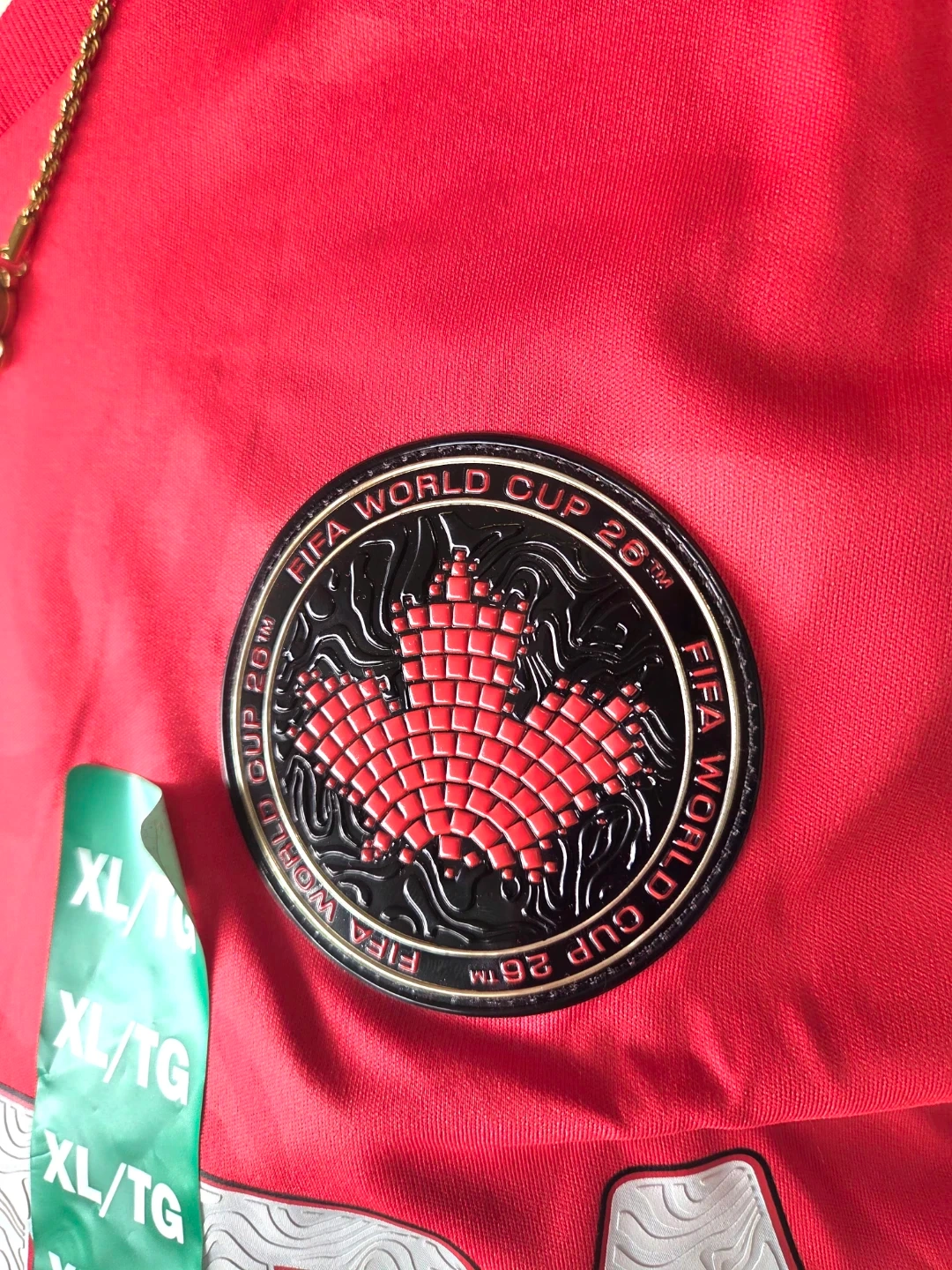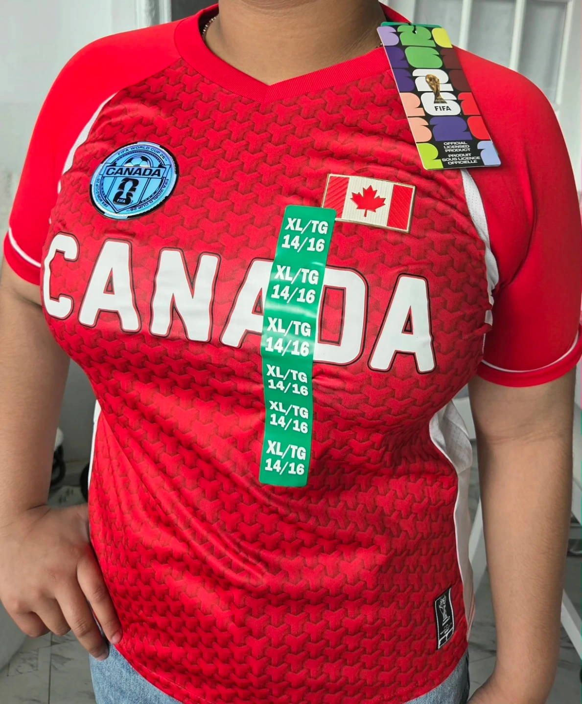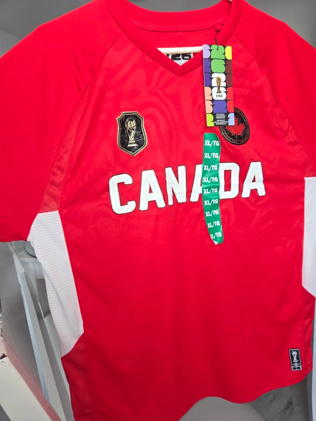 Red Canada FIFA World Cup jersey. Features 'CANADA' graphic and World Cup badges. Size XL/TG