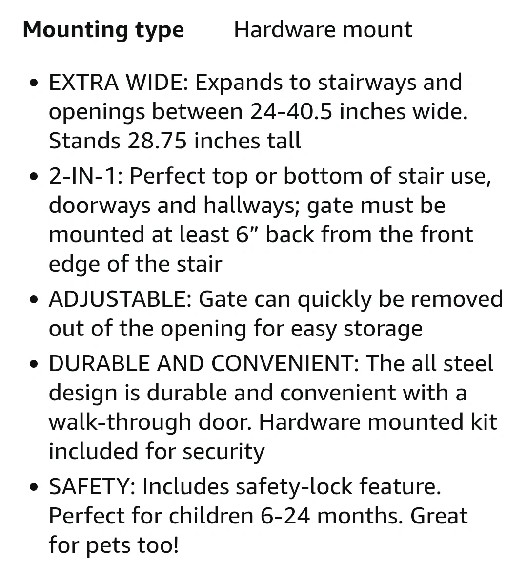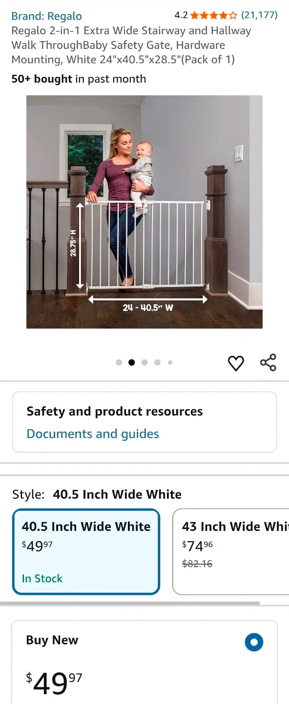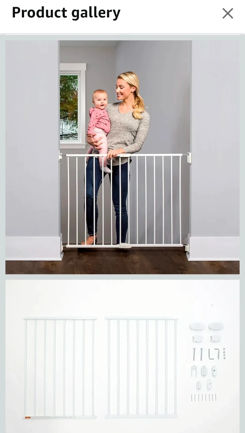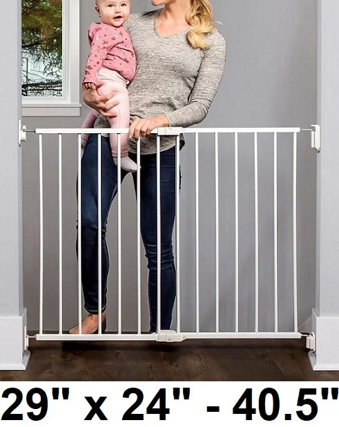 Keep your little one safe with this Regalo 2-in-1 Extra Wide White Baby Gate, perfect for doorways, hallways, and stairs, fitting openings between 24 to 40.5 inches wide, and standing 28.75 inches tall. This gate is hardware mounted and features a safety-lock, making it ideal for children aged 6-24 months and even pets. This item is new and comes with all original hardware for secure installation.
