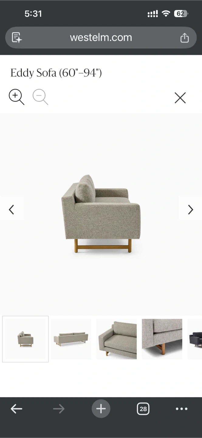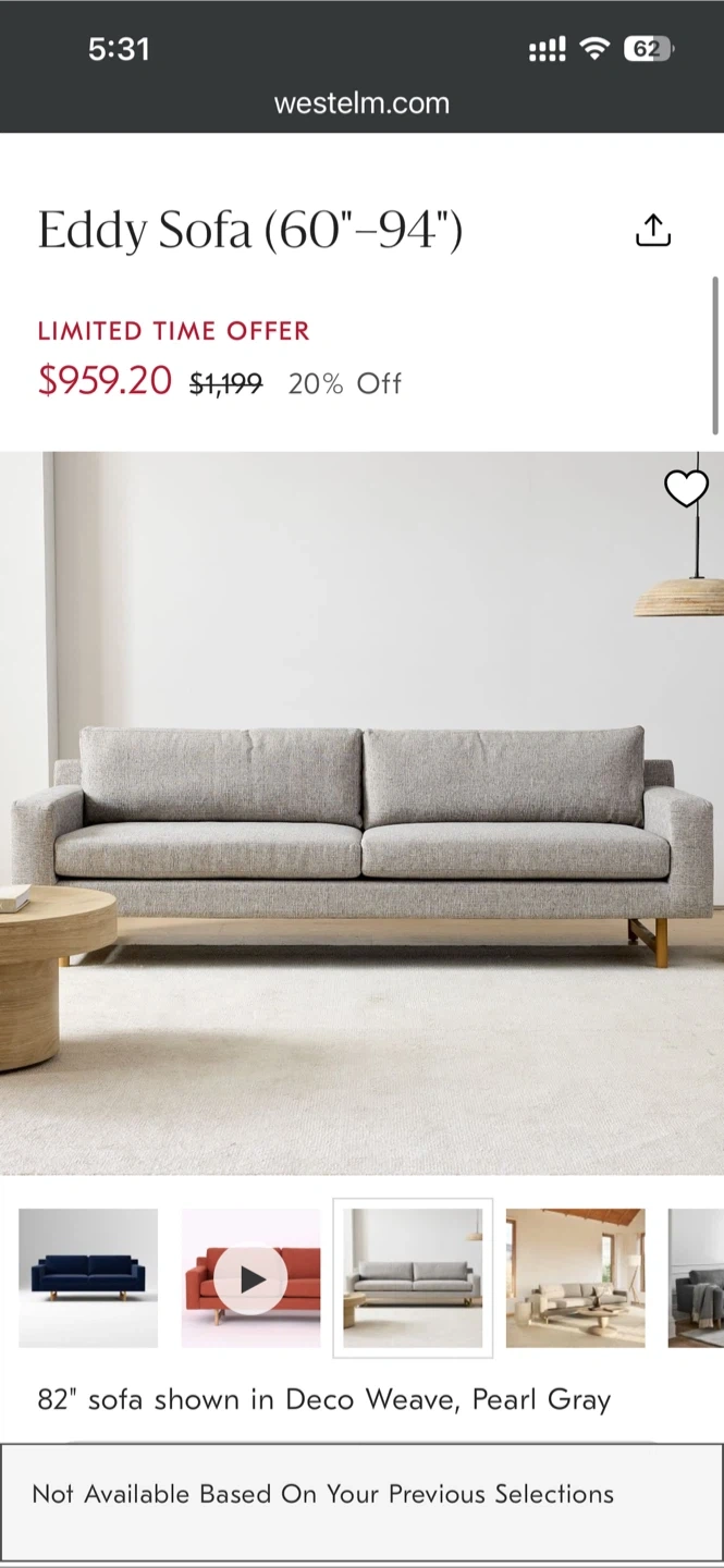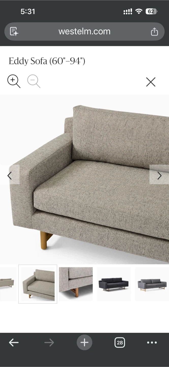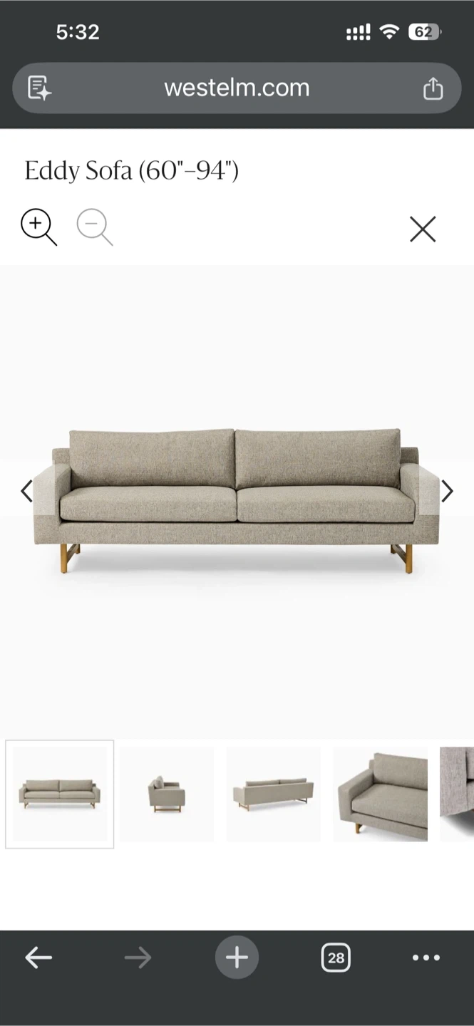 Selling a West Elm Eddy Sofa in Pearl Gray! This sofa is a stylish and comfortable addition to any living space. The screenshot indicates it ranges from 60 to 94 inches. It's in great condition and ready for a new home!