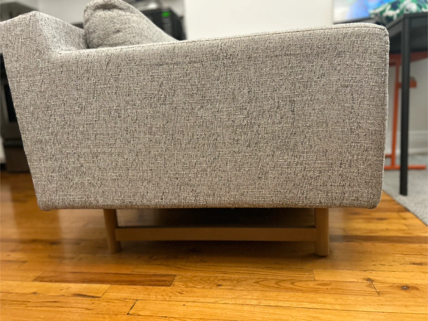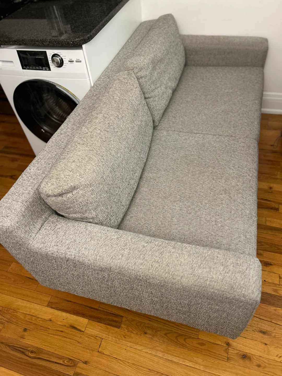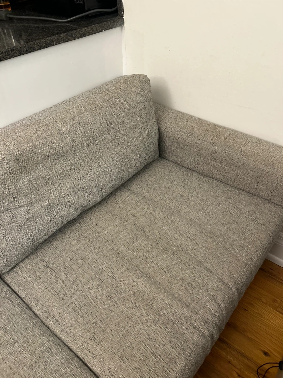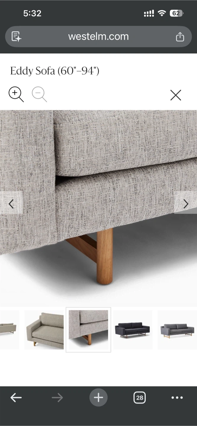 Selling a West Elm Eddy Sofa in Pearl Gray! This sofa is a stylish and comfortable addition to any living space. The screenshot indicates it ranges from 60 to 94 inches. It's in great condition and ready for a new home!
