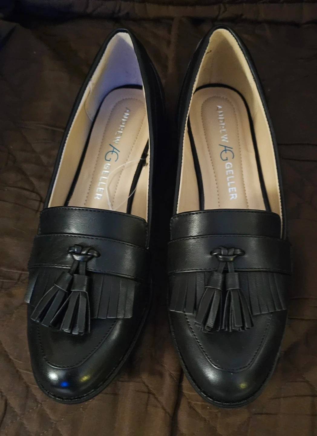 Andrew Geller black tassel loafers. Size 7.5M. Made with all man-made materials. These are stylish and comfortable shoes for everyday wear.