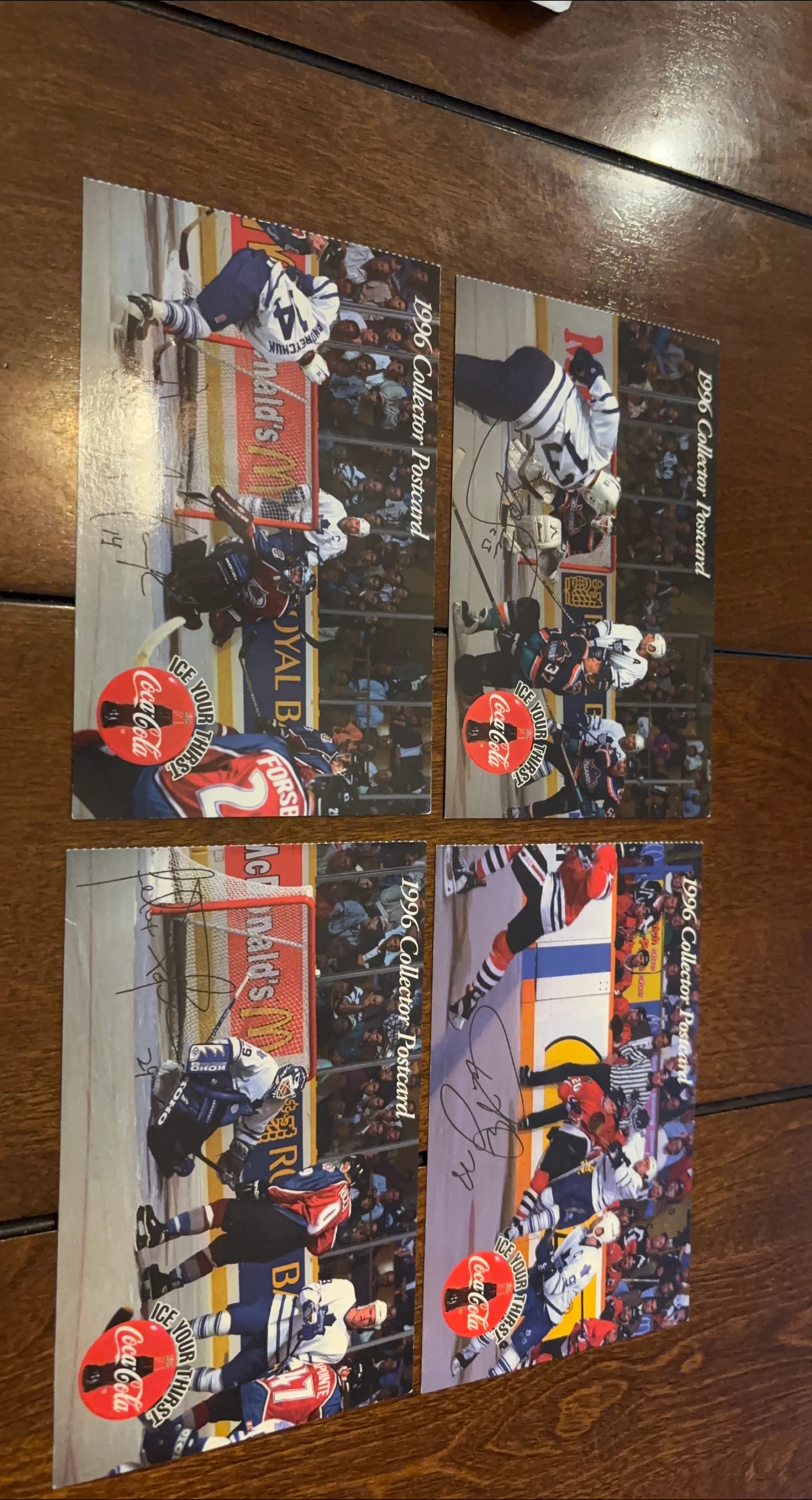 Selling a set of 1996 collector postcards featuring hockey players and the Coca-Cola logo. These postcards capture moments from the 1996 hockey season