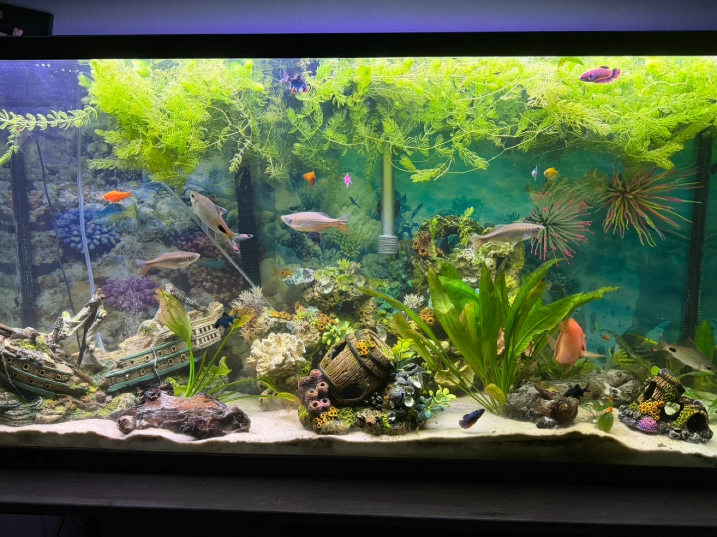 The fish tank is 55 gallon, full of live plants, drift wood and a few decorations. Some of the decorations is a big ship which has a bubbler, big rock that also has a bubbler and a couple others, comes with food & everything else. Comes with all the fish also.