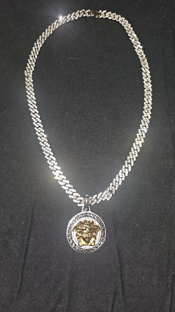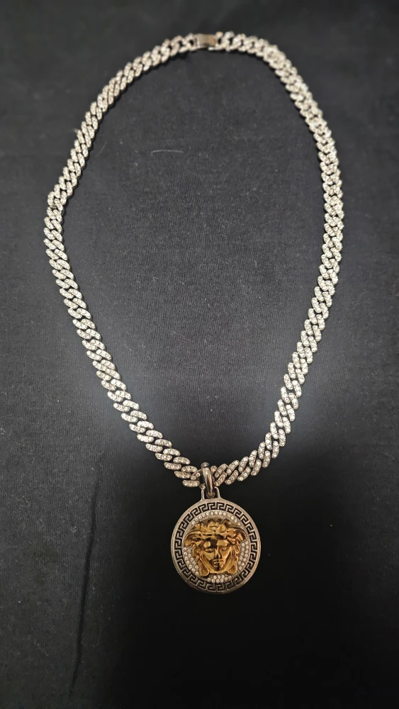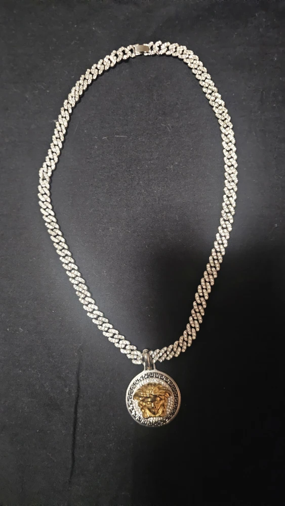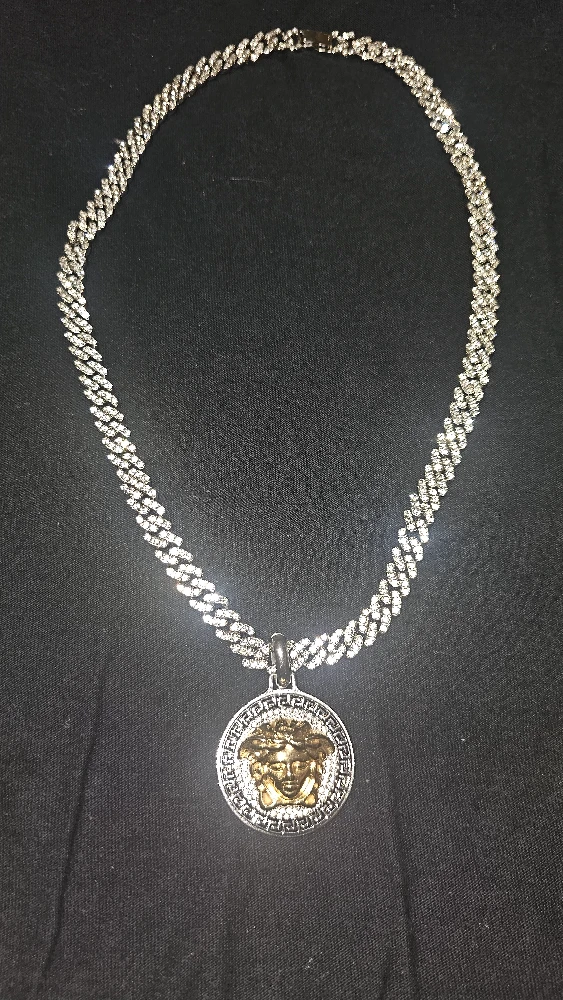 Selling a Versace Medusa pendant chain necklace. The chain is silver with a circular gold Medusa pendant. It's brand new