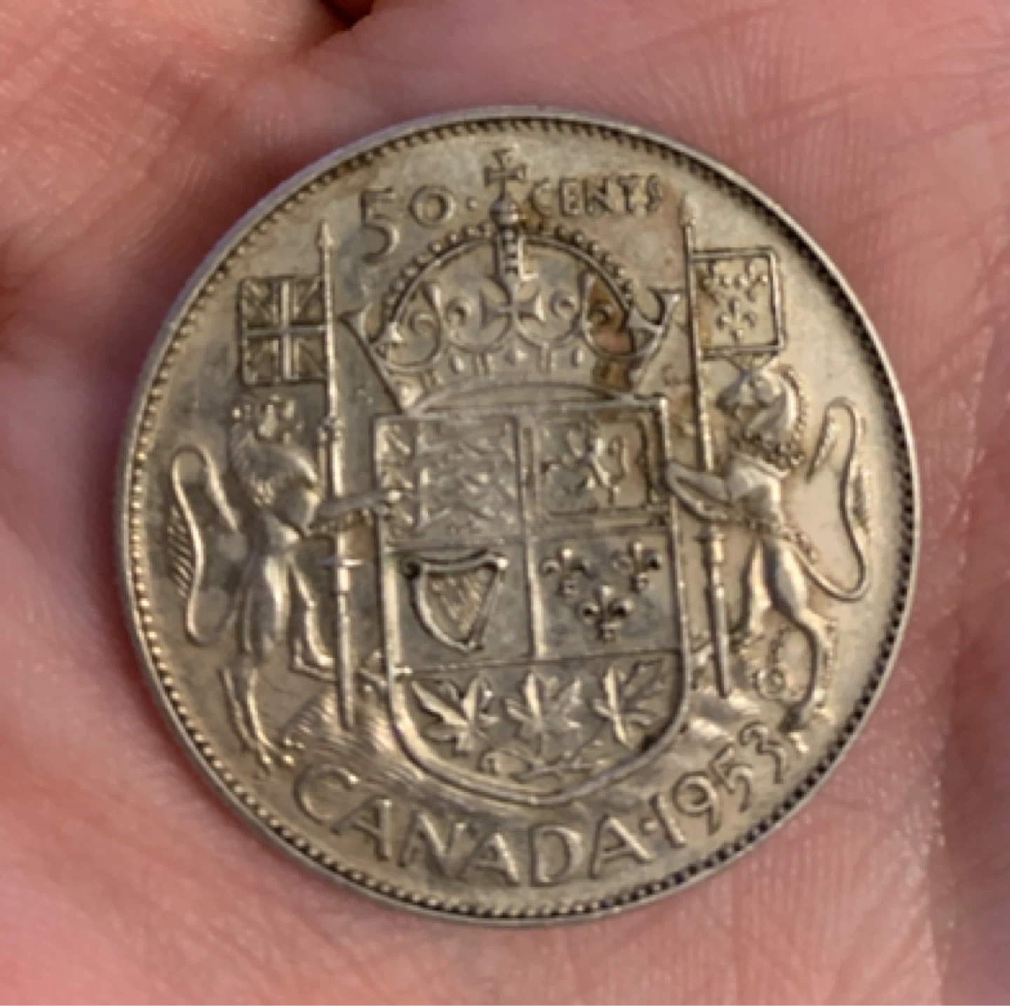 Selling a 1953 Canadian 50 cent coin. It has some wear, but the details are still visible. A great piece for any coin collector!