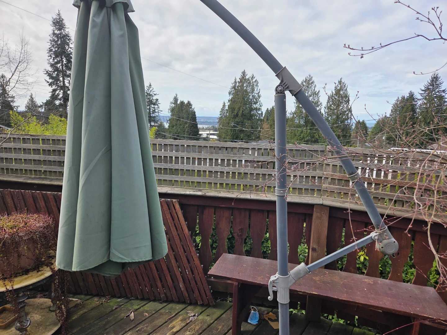 This is a large cantilever patio umbrella with a grey metal frame and a sage green canopy. It includes a heavy concrete base for stability. It's perfect for providing shade over outdoor seating areas.