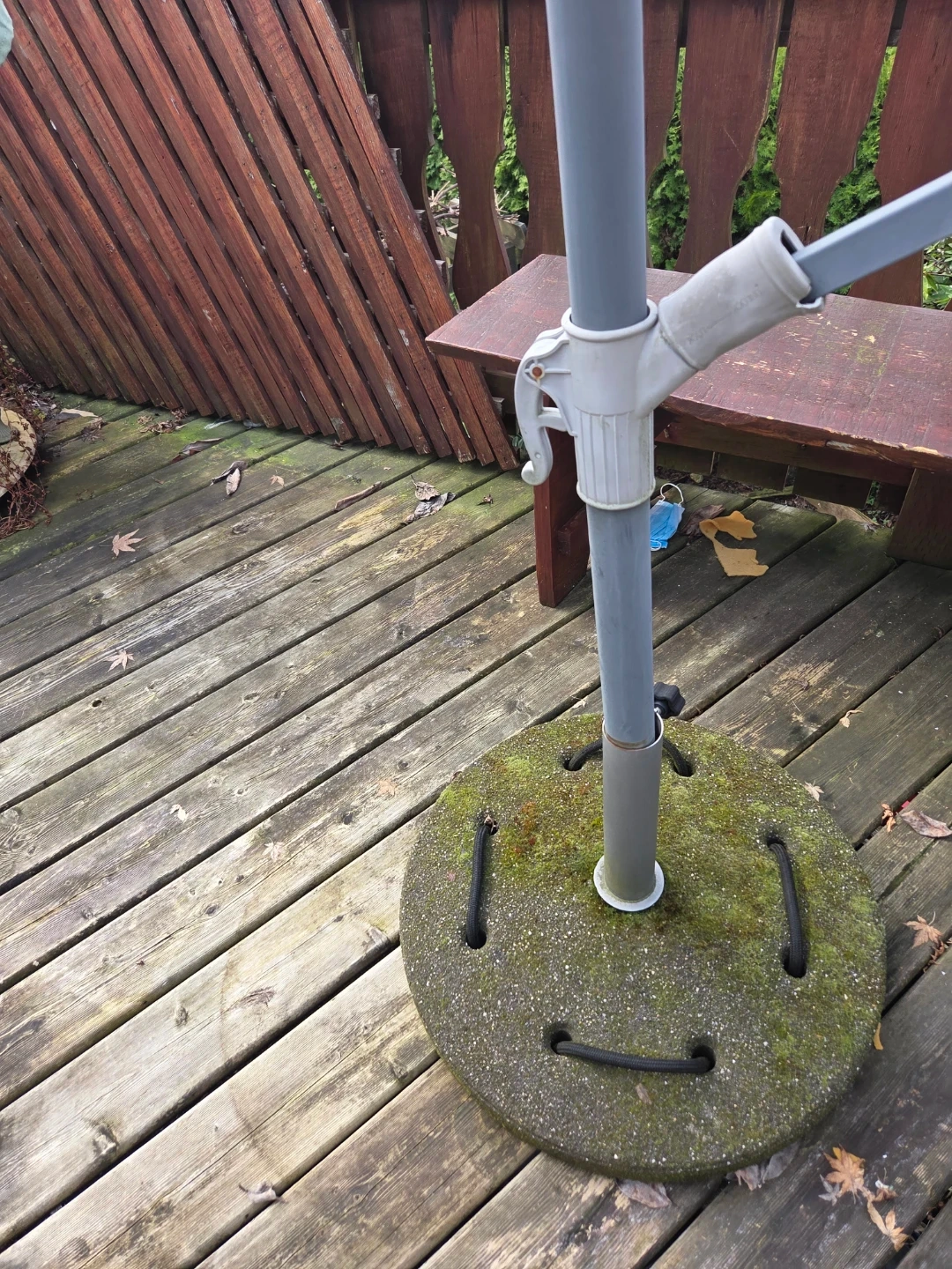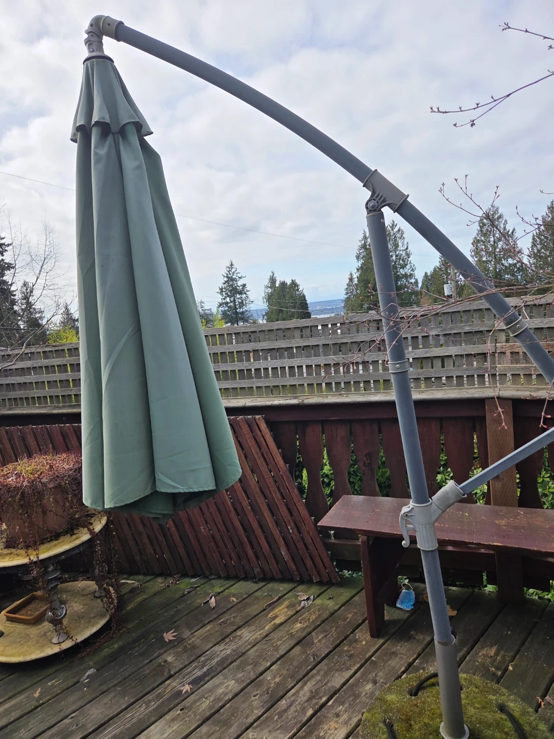 This is a large cantilever patio umbrella with a grey metal frame and a sage green canopy. It includes a heavy concrete base for stability. It's perfect for providing shade over outdoor seating areas.