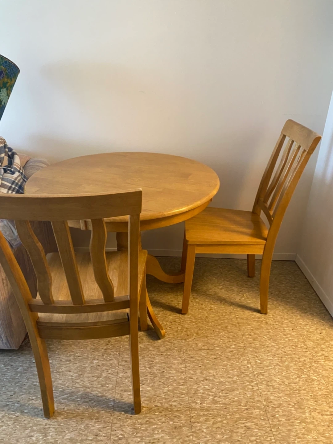This is a light wood finish round dining table set. It includes the table and two matching chairs. The table has a pedestal base with four curved legs. Chair backs have a slatted design. Simple and classic style for a dinette or small eating area.