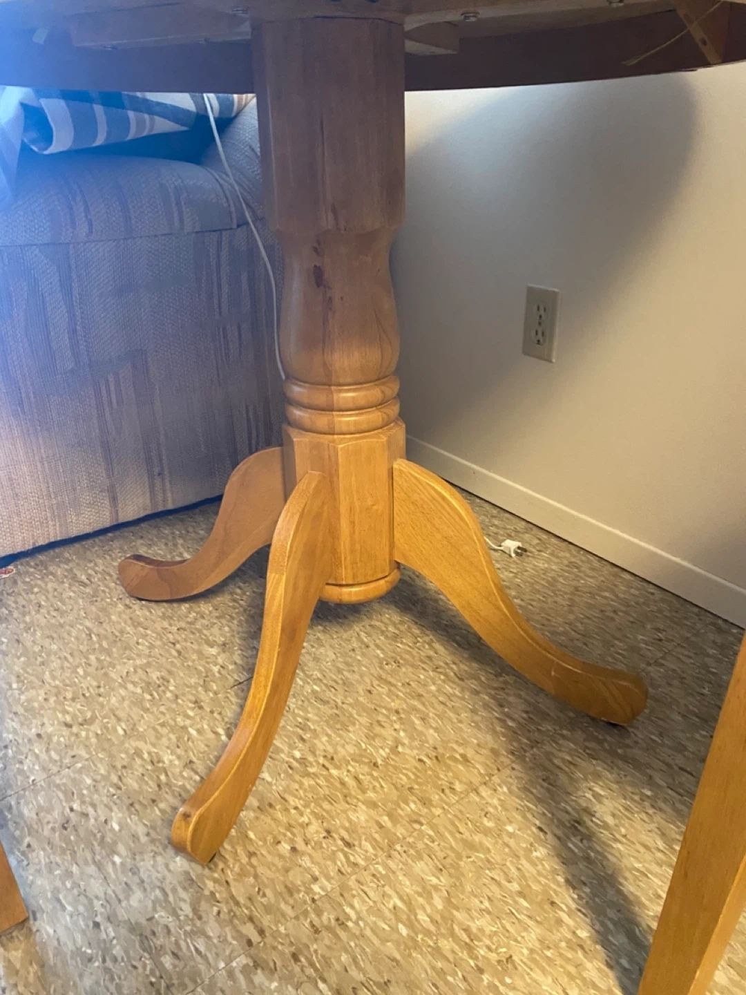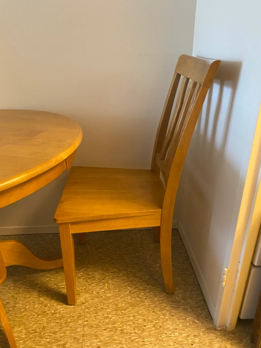This is a light wood finish round dining table set. It includes the table and two matching chairs. The table has a pedestal base with four curved legs. Chair backs have a slatted design. Simple and classic style for a dinette or small eating area.