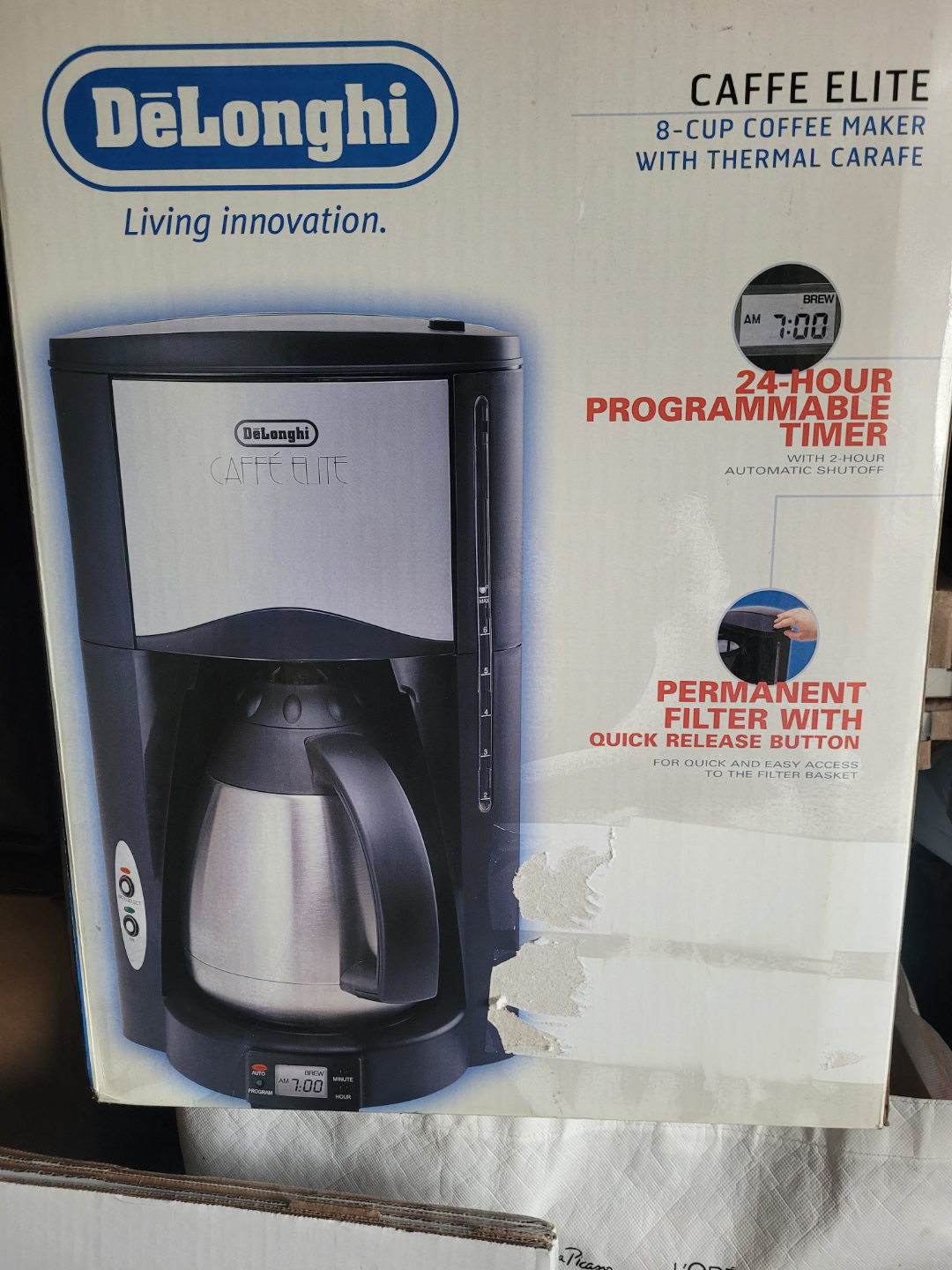 8-cup coffee maker, thermal carafe, 24-hour programmable timer, permanent filter with quick release button. Automatic shutoff.
