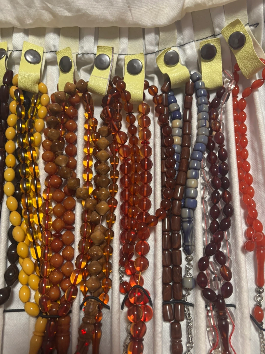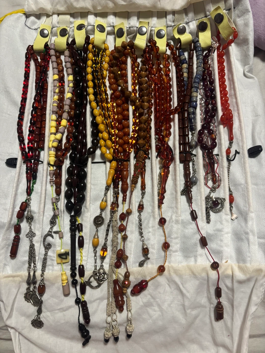 A collection of assorted prayer beads. These beads are made from various materials including amber, wood, and stone. Each strand has unique bead shapes and decorative tassels or metal charms. They're suitable for personal use or as a decorative item.