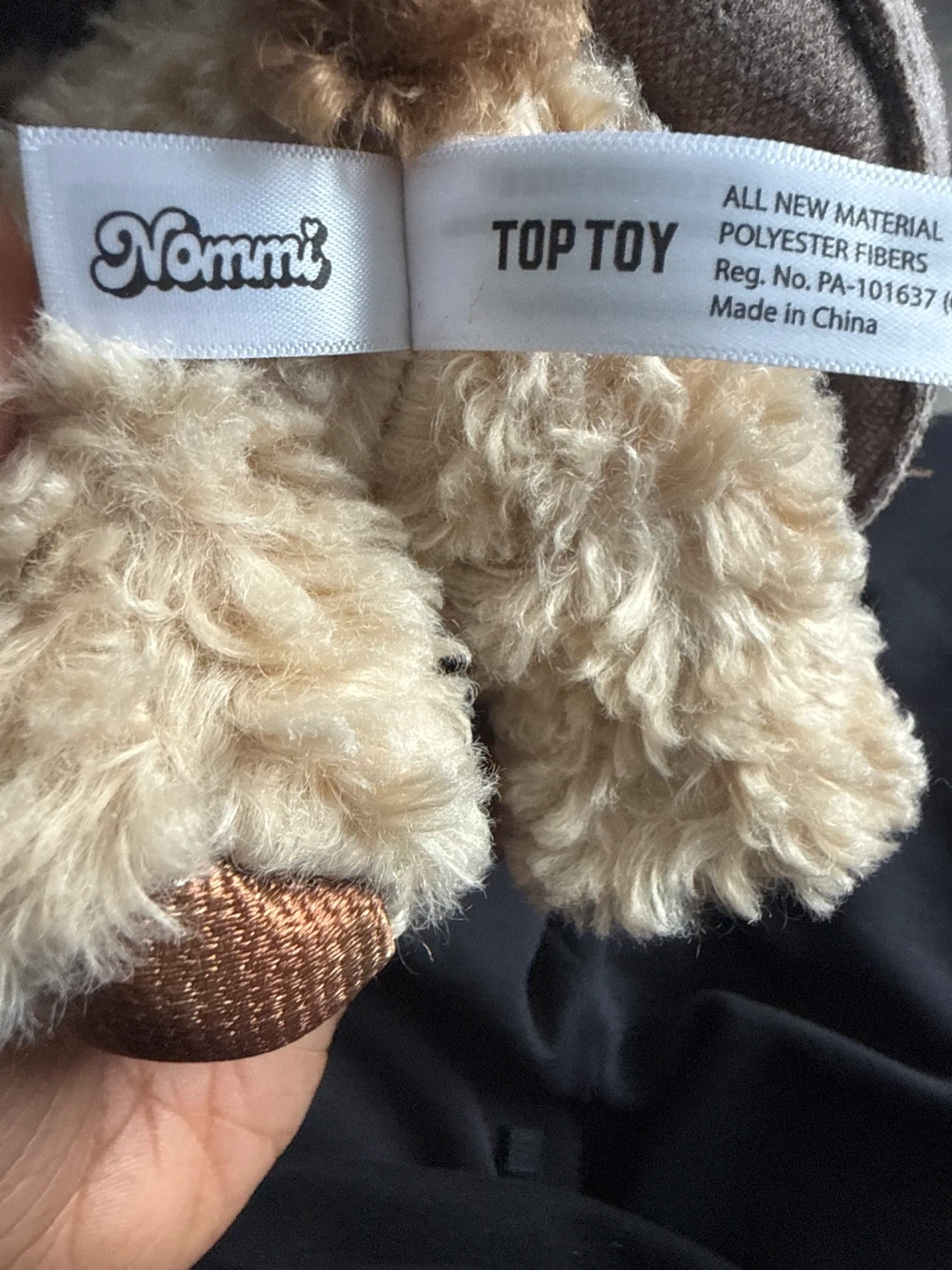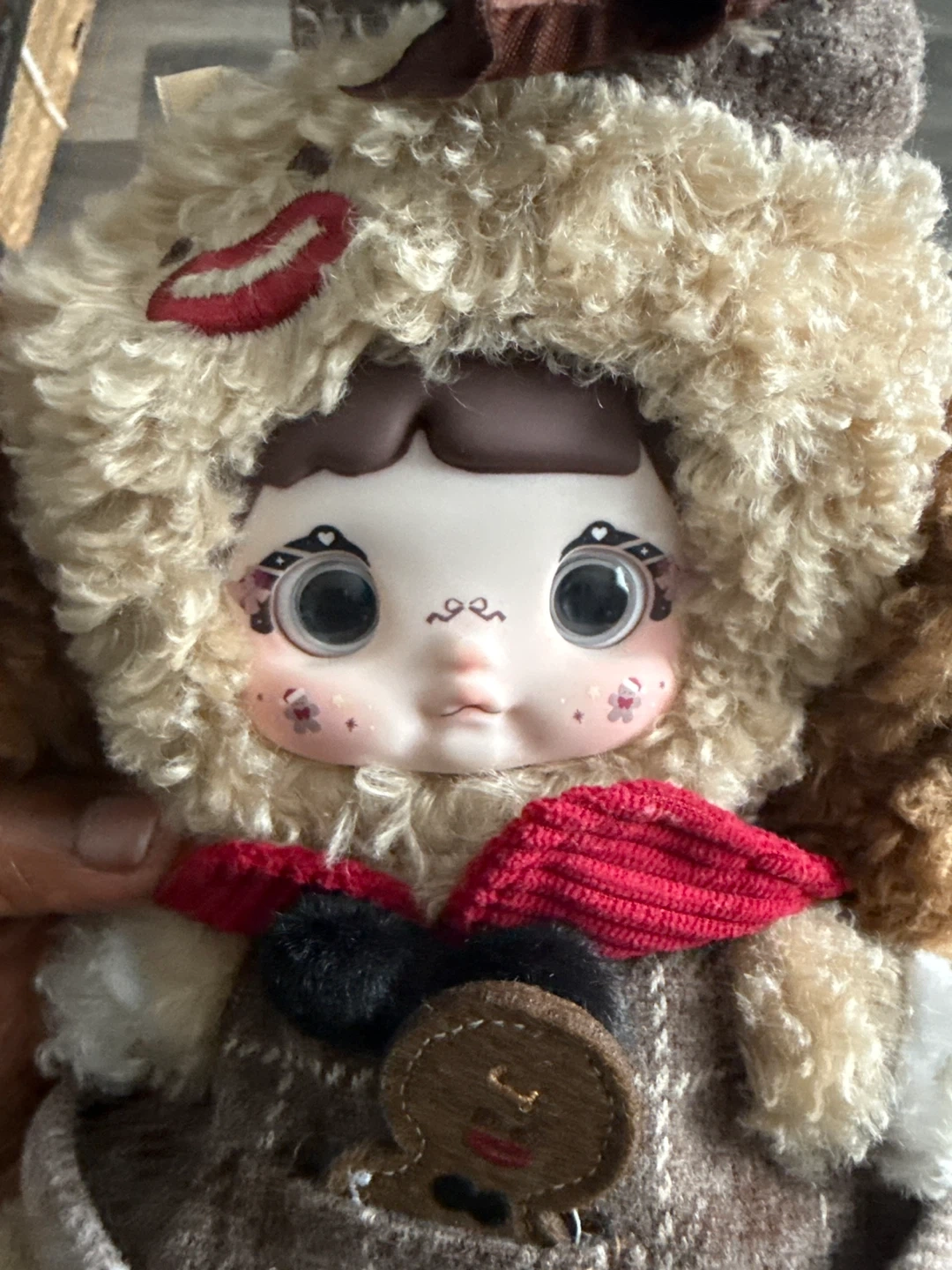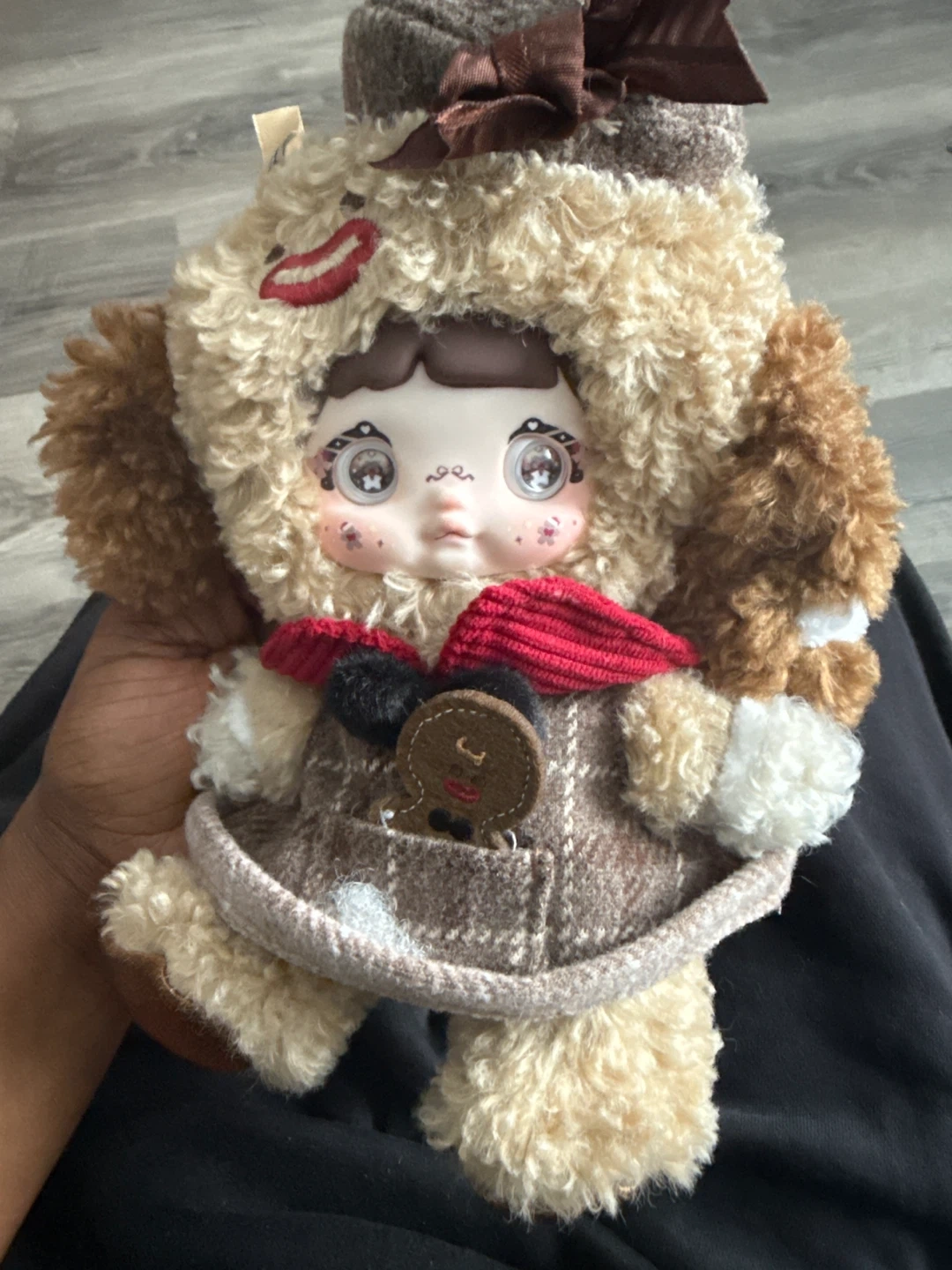 This is a cute doll with a furry hood and outfit. It has detailed facial features and a gingerbread button accent. Made from textile fibers.