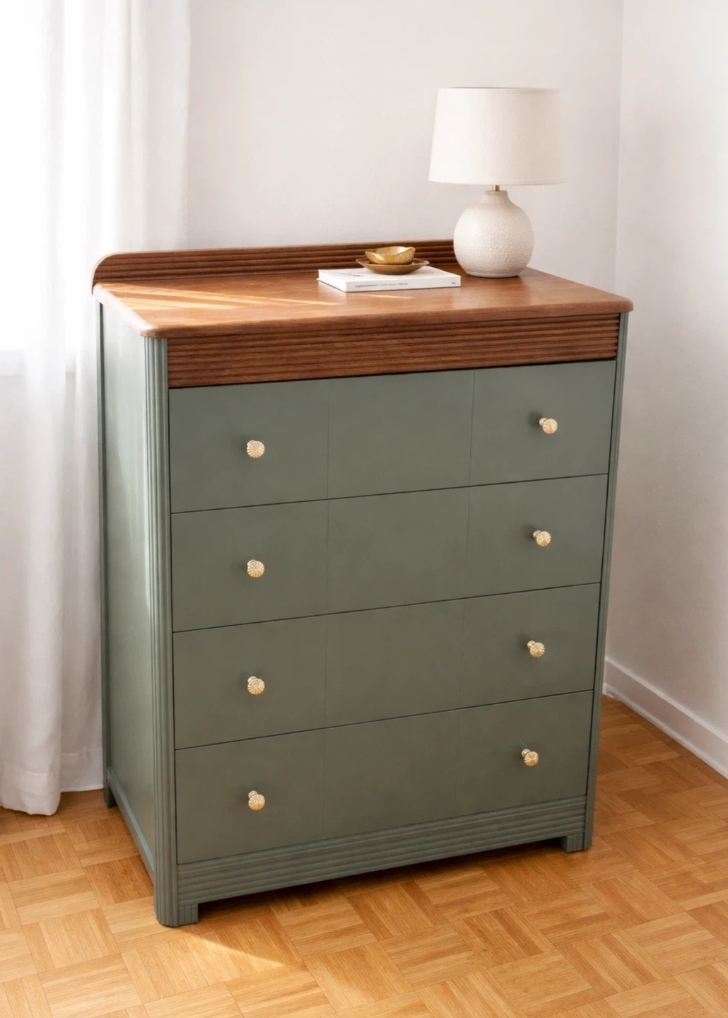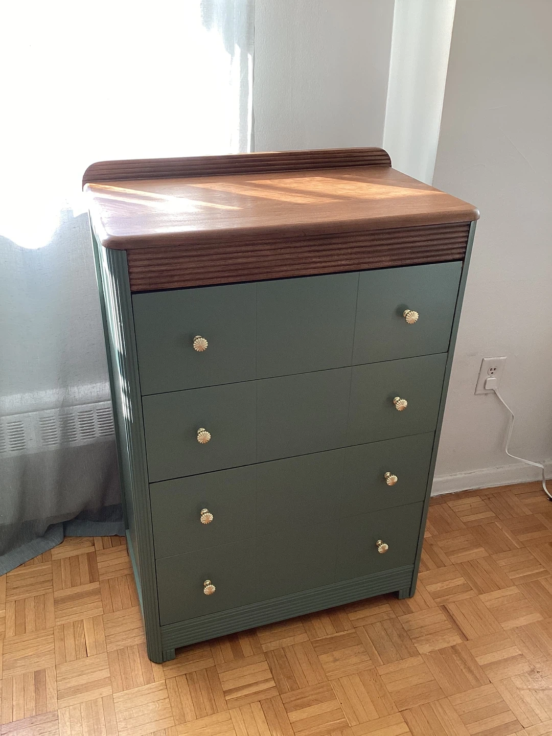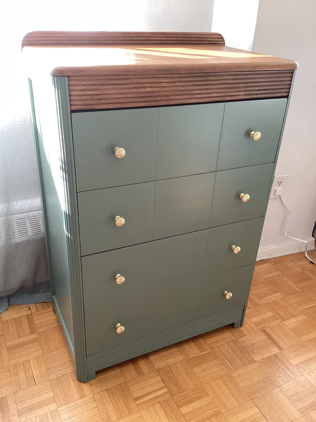 Beautiful newly refinished dresser in a muted sage/olive green with a warm solid wood top and gold knobs. Clean lines with subtle curved details give it a timeless mid-century feel that works well in both modern and classic spaces.