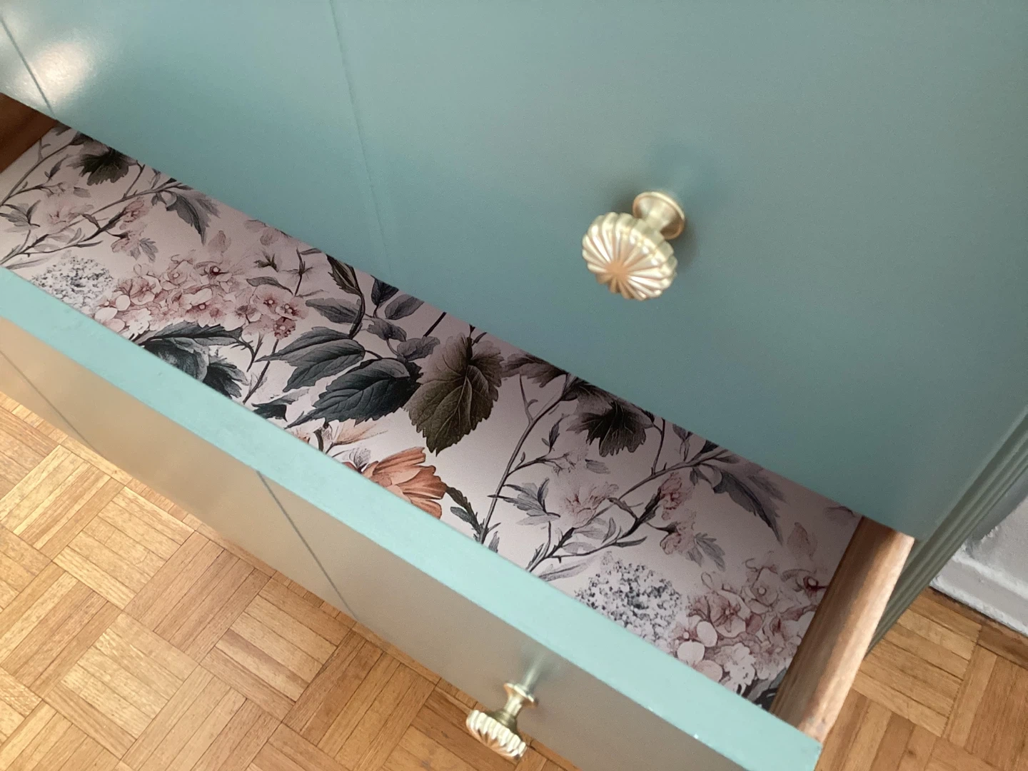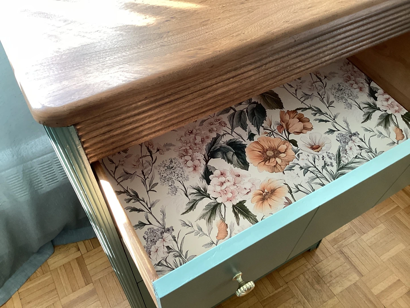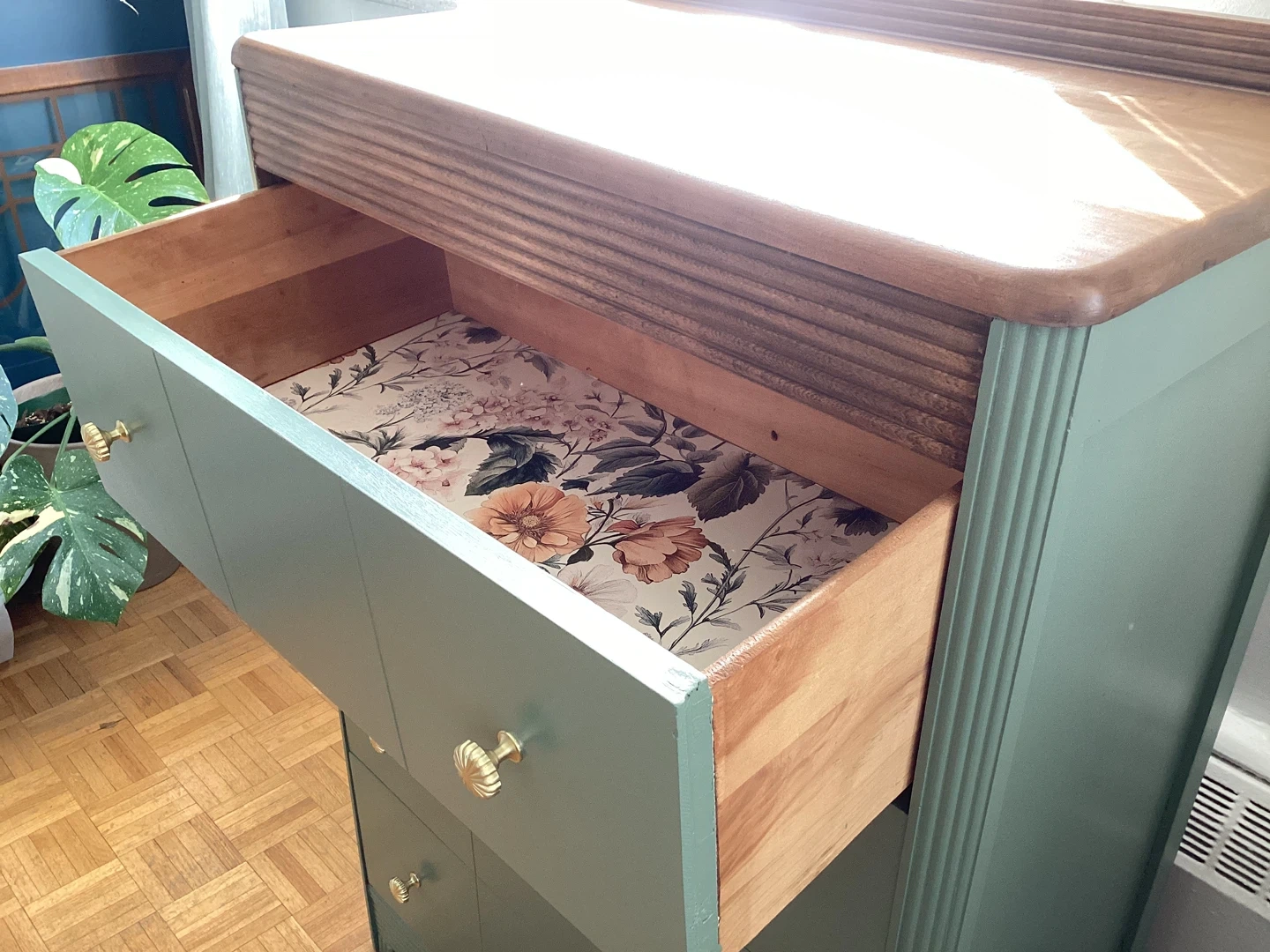 Beautiful newly refinished dresser in a muted sage/olive green with a warm solid wood top and gold knobs. Clean lines with subtle curved details give it a timeless mid-century feel that works well in both modern and classic spaces.