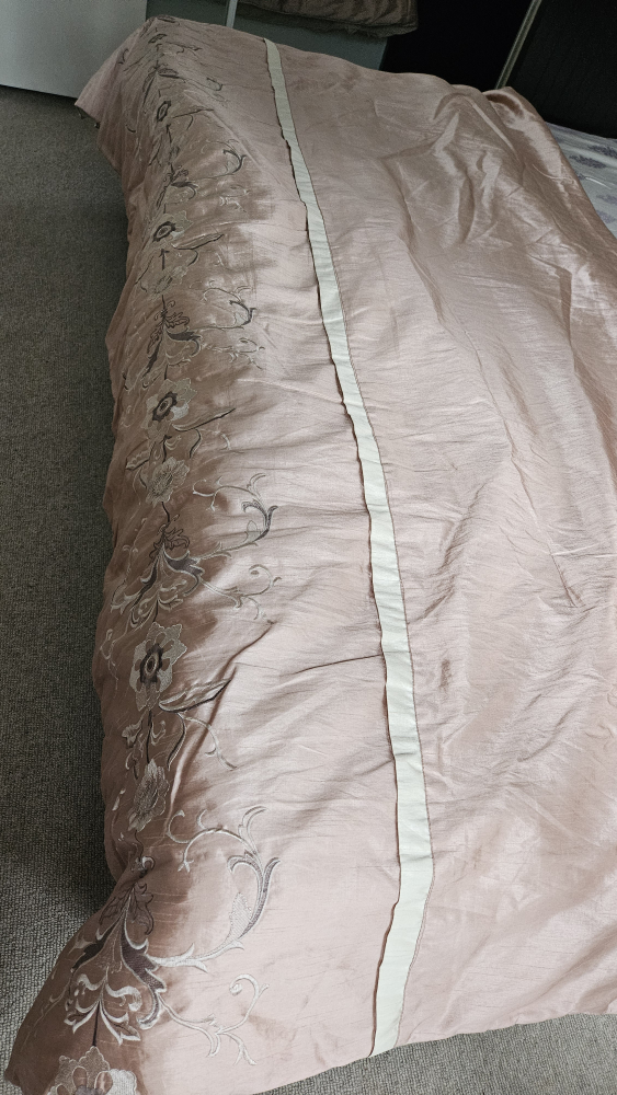 Selling a beautiful queen-size duvet cover with delicate floral embroidery. The material is a soft, light pink colour with a subtle sheen. It would add a touch of elegance to any bedroom!