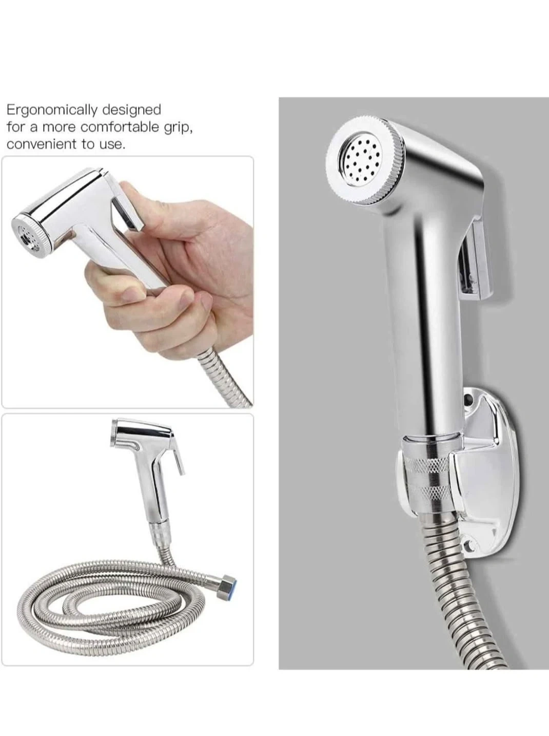 This bidet sprayer set includes a chrome metal handheld showerhead and a flexible hose. It's ergonomically designed for a comfortable grip and convenient to use. It comes with a wall mount bracket and screws for easy installation.