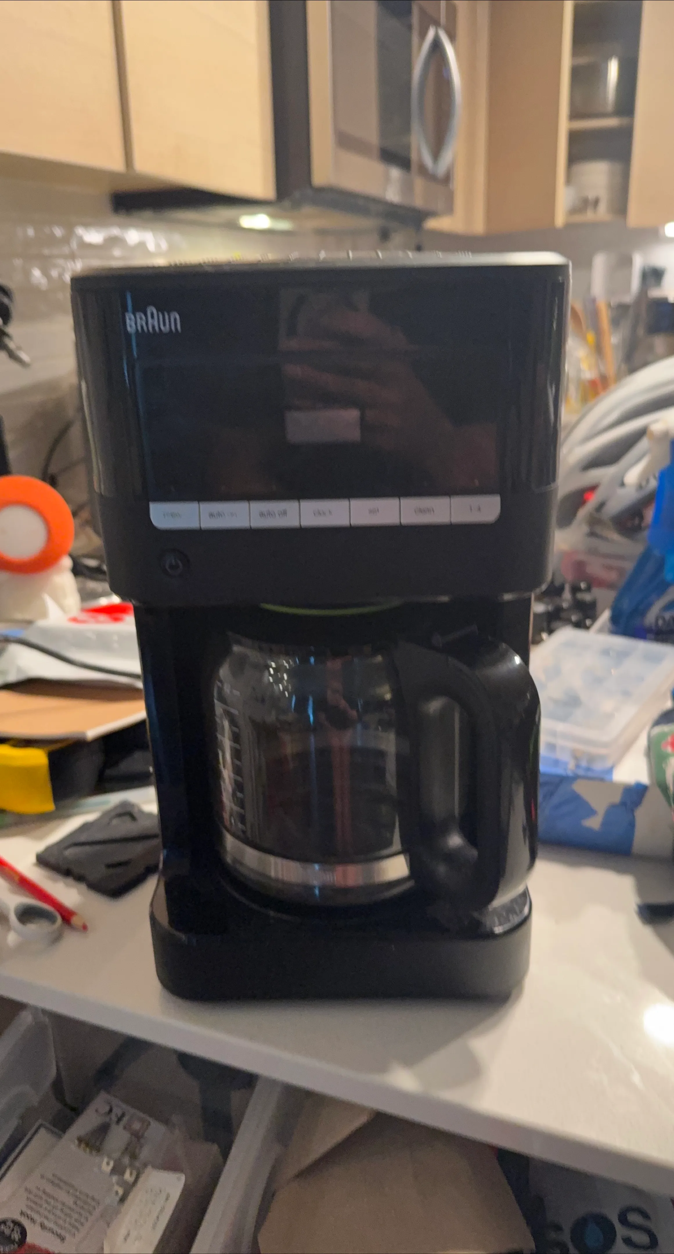 This is a black Braun coffee maker with a glass carafe. It has programmable features for auto on and auto off. This coffee maker is great for making a fresh pot of coffee any time of day.