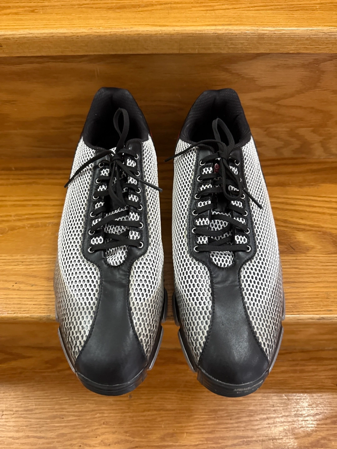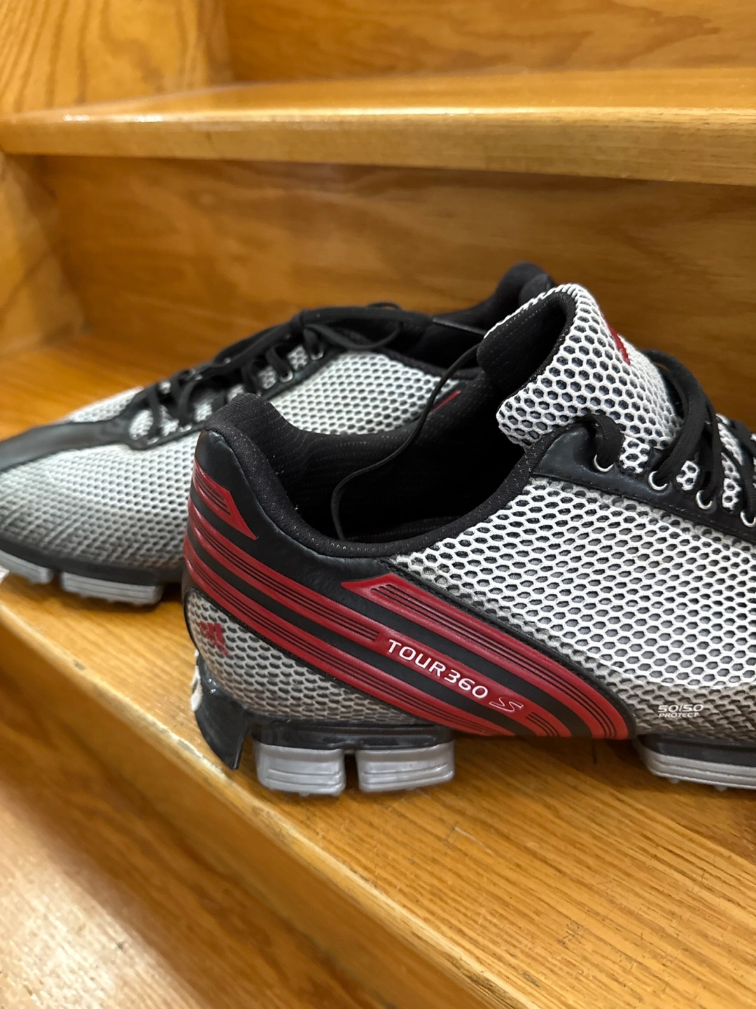Selling a pair of Adidas Tour 360 S golf shoes in size 13 US. They feature a black and white design with red accents. The soles have Powerband Chassis for stability and grip. These shoes are in great condition and are ready for the golf course!