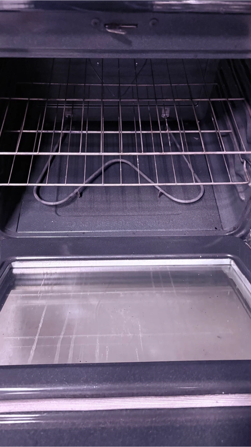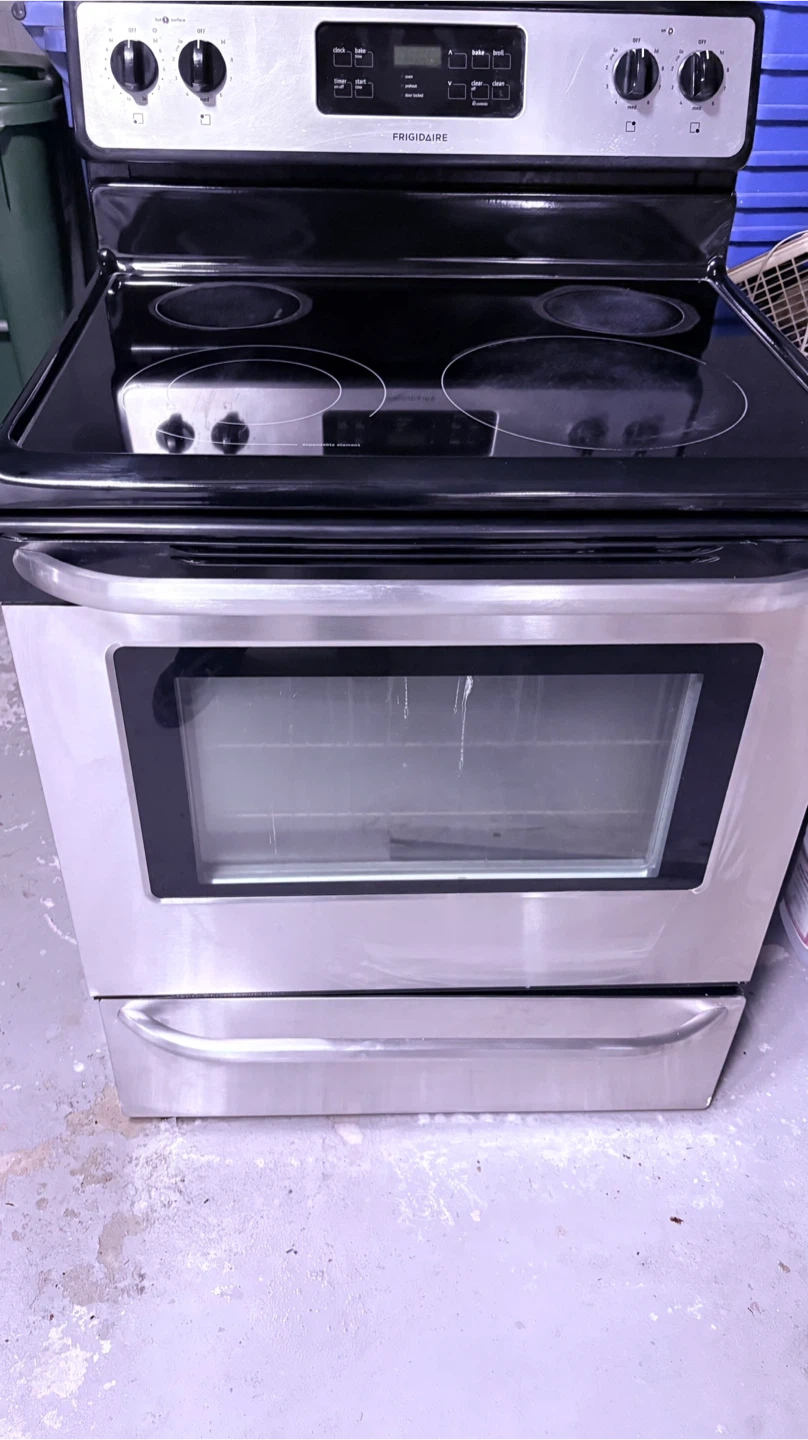 This Frigidaire stove has a smooth glass cooktop with four electric burners. It features an oven with racks and a convenient storage drawer at the bottom. Expandable element on cooktop for versatile cooking! It's a great addition to any kitchen.