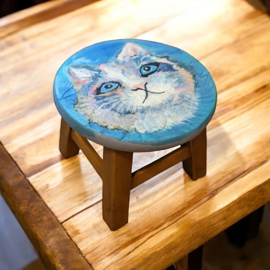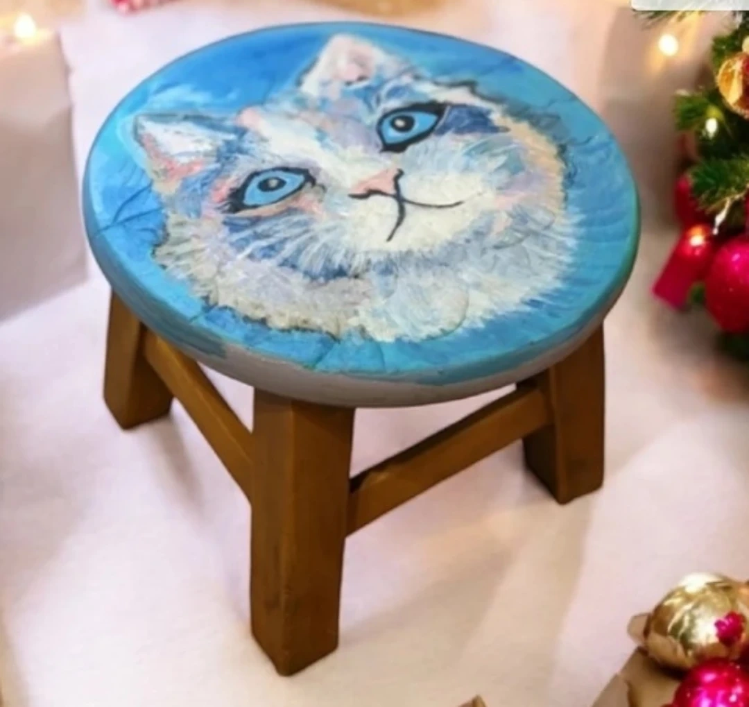 Handcrafted foot rest painting cat portrait:Max sees sky