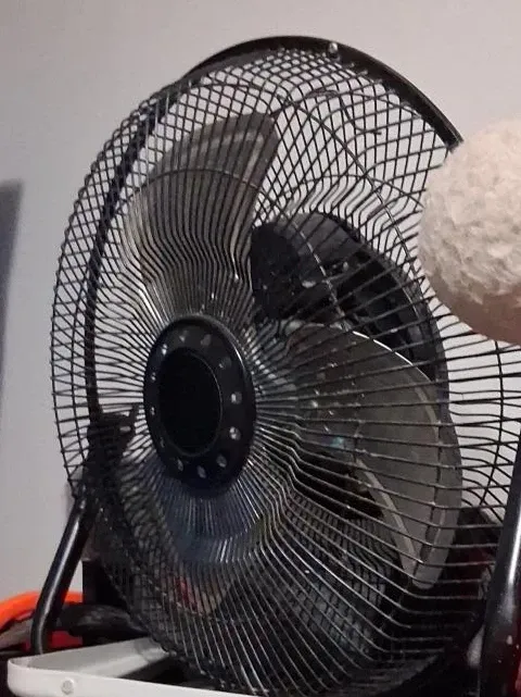 This is a black oscillating fan. It has a metal grill and multiple speed settings. Great for keeping a room cool!🧡