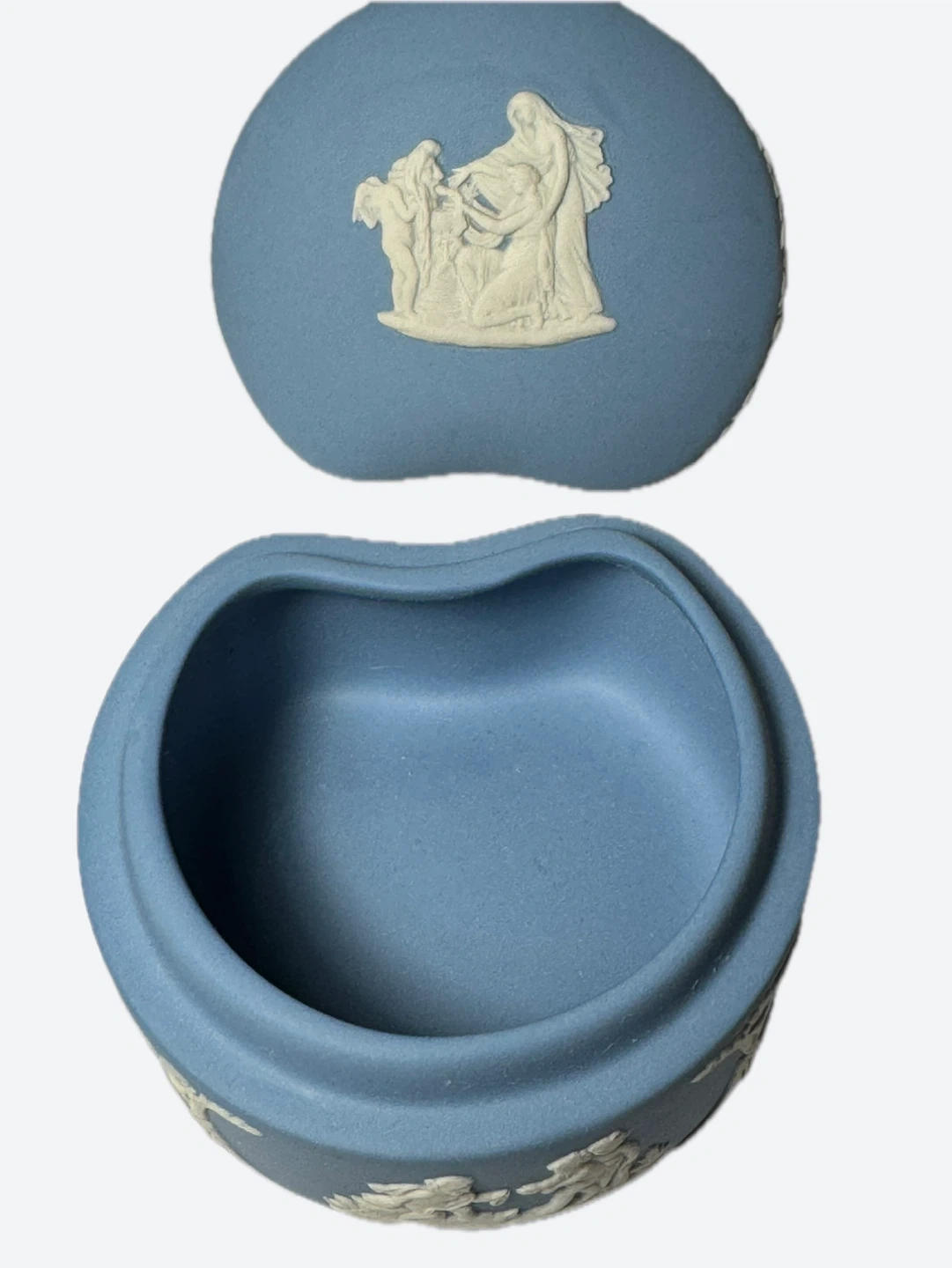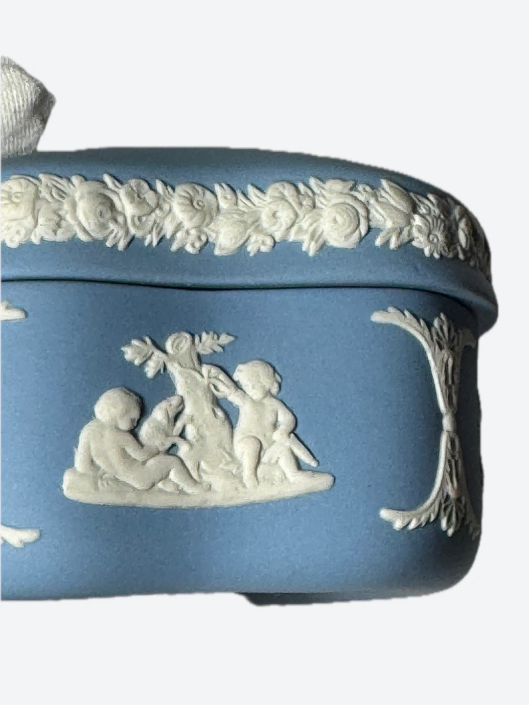 Beautiful blue Jasperware trinket box adorned with white cherub and floral reliefs.