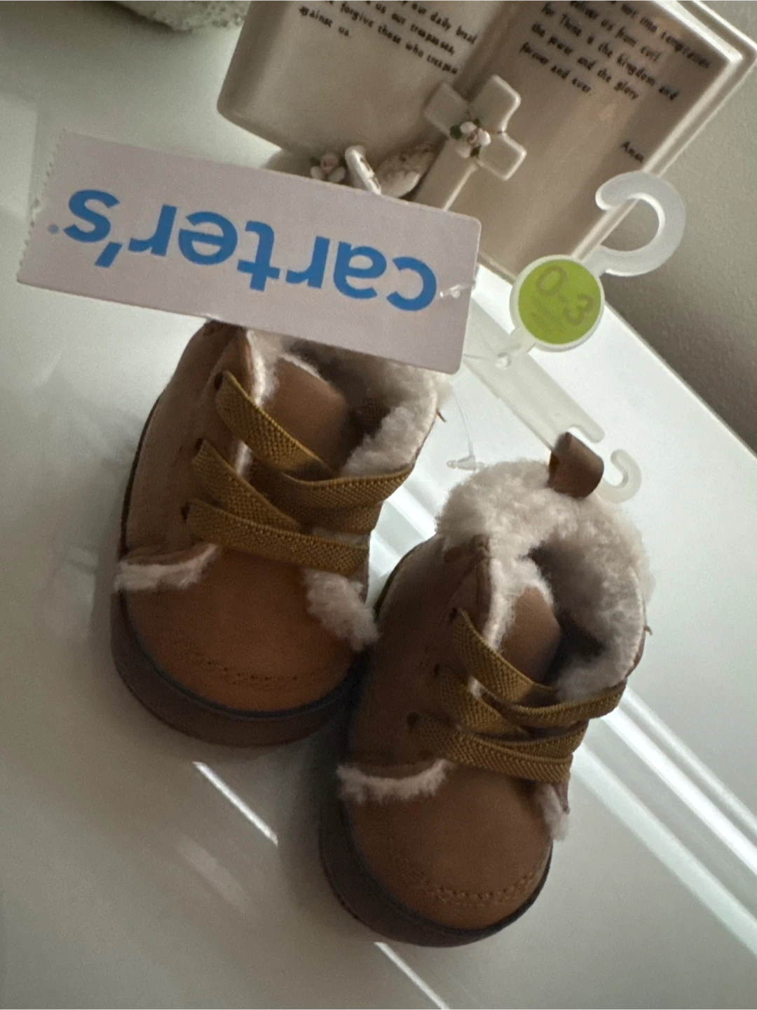 Brown Carters baby boots with faux fur lining. Lace-up closure for a secure fit. Size is 0-3 months. These are perfect for keeping little feet warm during colder weather!