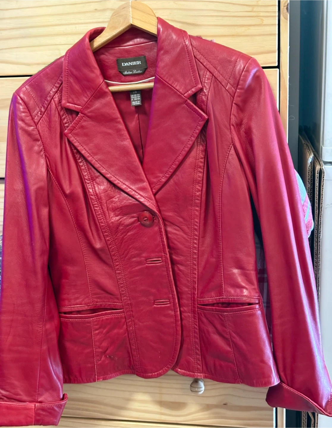 DANIERE leather blazer jacket in a vibrant red. Features a classic notched lapel and a single-button closure. Made from genuine leather. Size is marked as L (UK 42-44).